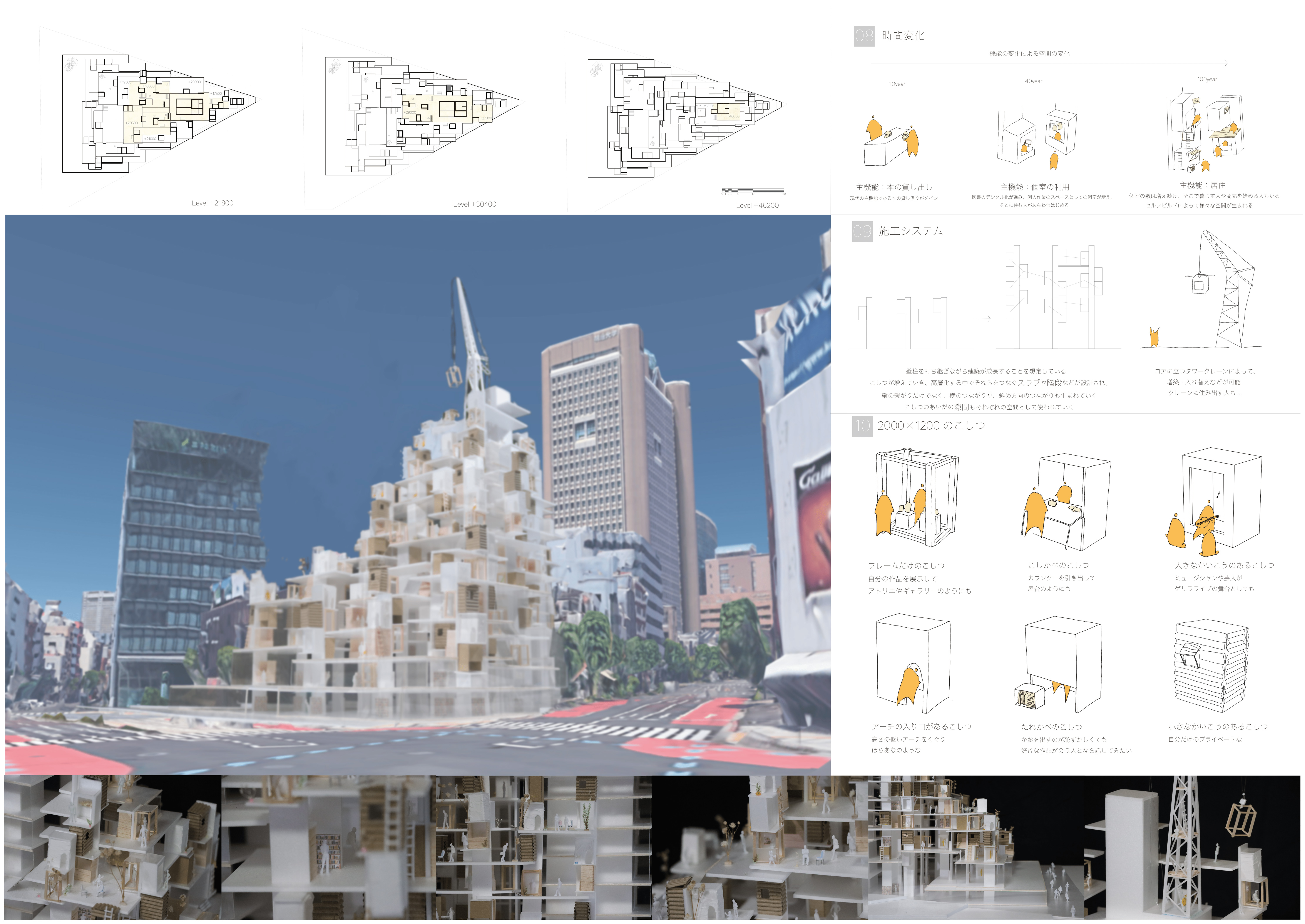 公共空間に人が住み着き、新しい図書館を作り上げていく住人のセルフ的生命力や即興的な振る舞いなどをスラム性と表現し、生活から商売まで自由に行う場としての公共図書館を提案する。神保町は世界でも稀に見る多様なでまちである。駿河台下交差点を起点として、靖国通りやすずらん通りを西へ行くと書店街、古書店街が広がり、明大通りを御茶ノ水駅へと上がっていくと楽器街が展開する。また、商店街を背に靖国通りを東に進んでいくとスポーツ用品店が広がり、神保町全体を見れば大学や予備校が集まる学生街としての様相を呈している。これらは、神保町というまちが、様々な分野の専門的知識を持った人が集まり、その文化を作ったという歴史を持っていることに由来する。このような神保町に新しく図書館を設計する中で、これからの図書館であったり、公共性というものについて、N Yの公共図書館におけるホームレスの問題や東京のネカフェ難民などの問題を背景に、大学生や専門学生、お笑い芸人、小説家、アーティストなどが生活・作業・商売を行える場を設計した。