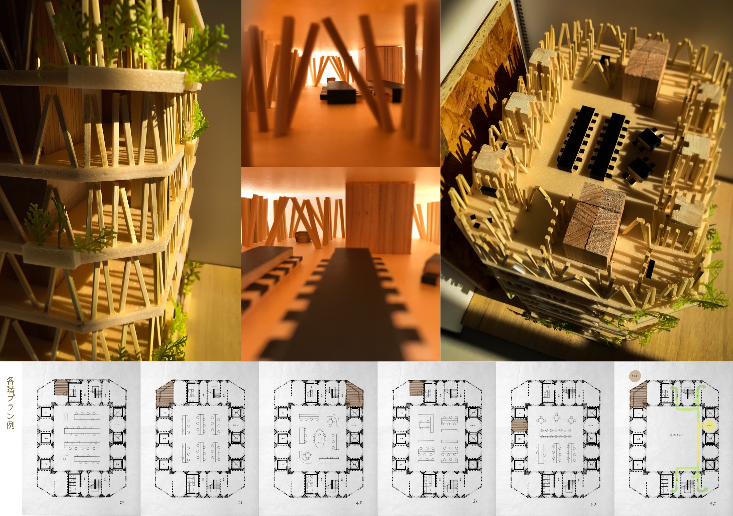 人を、人の意識を絡めとり、建物内外の事物をやわらかく受けとめて繋ぐ、そんなオフィスビルを計画したい。今回の提案では、「Veil」と名付けた木の構造体によってすべてをデザインする。細い木材で構成される木のヴェールは建物全体を包み、心地よいオフィス空間と美しいファサードを創り出す。内と外はやわらかく隔たれ、やわらかく繋がれる。ゆらめく木の構造体は軽やかで親しみやすく、人やモノが絡まる余剰を備えている。