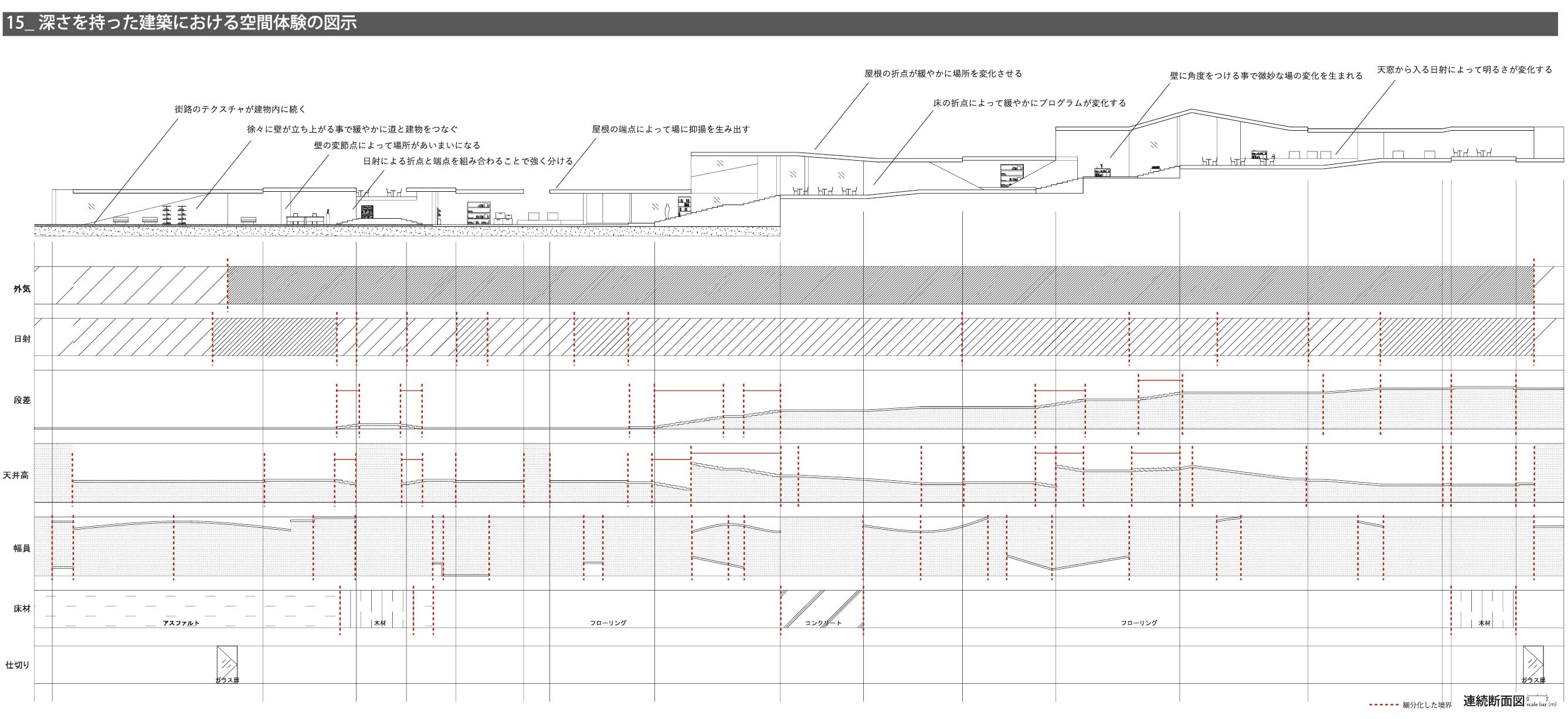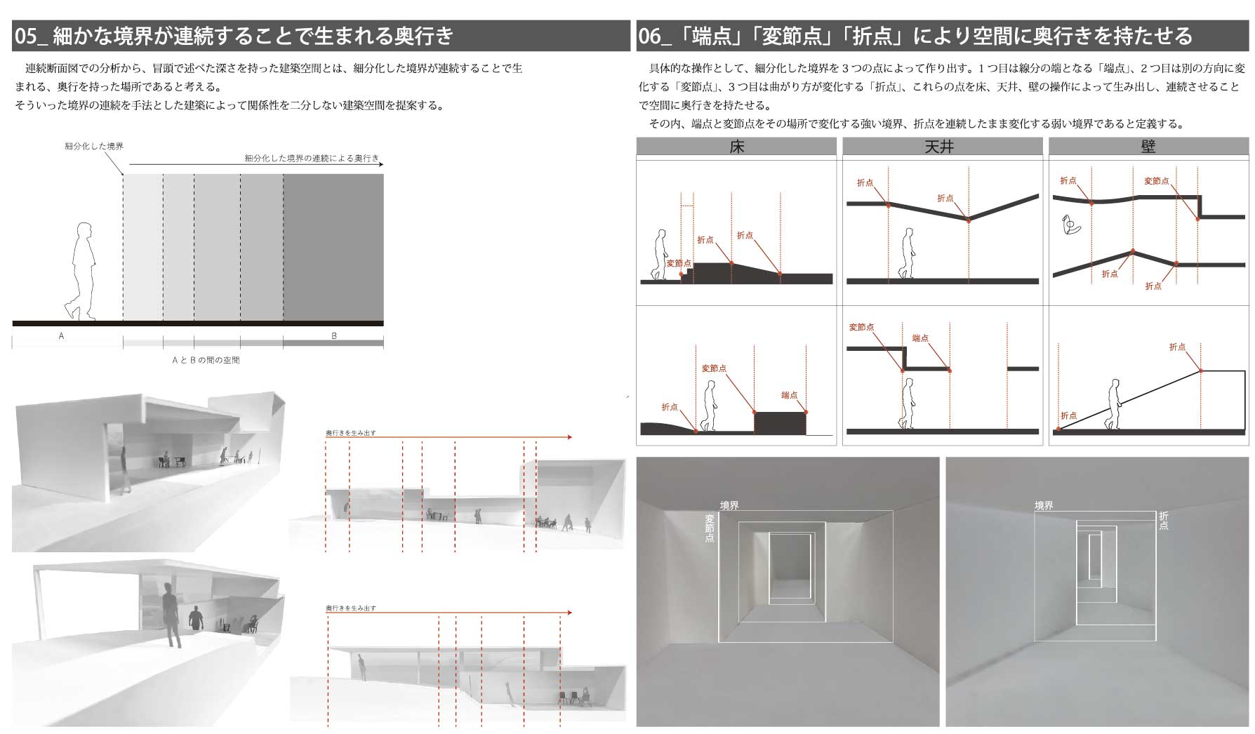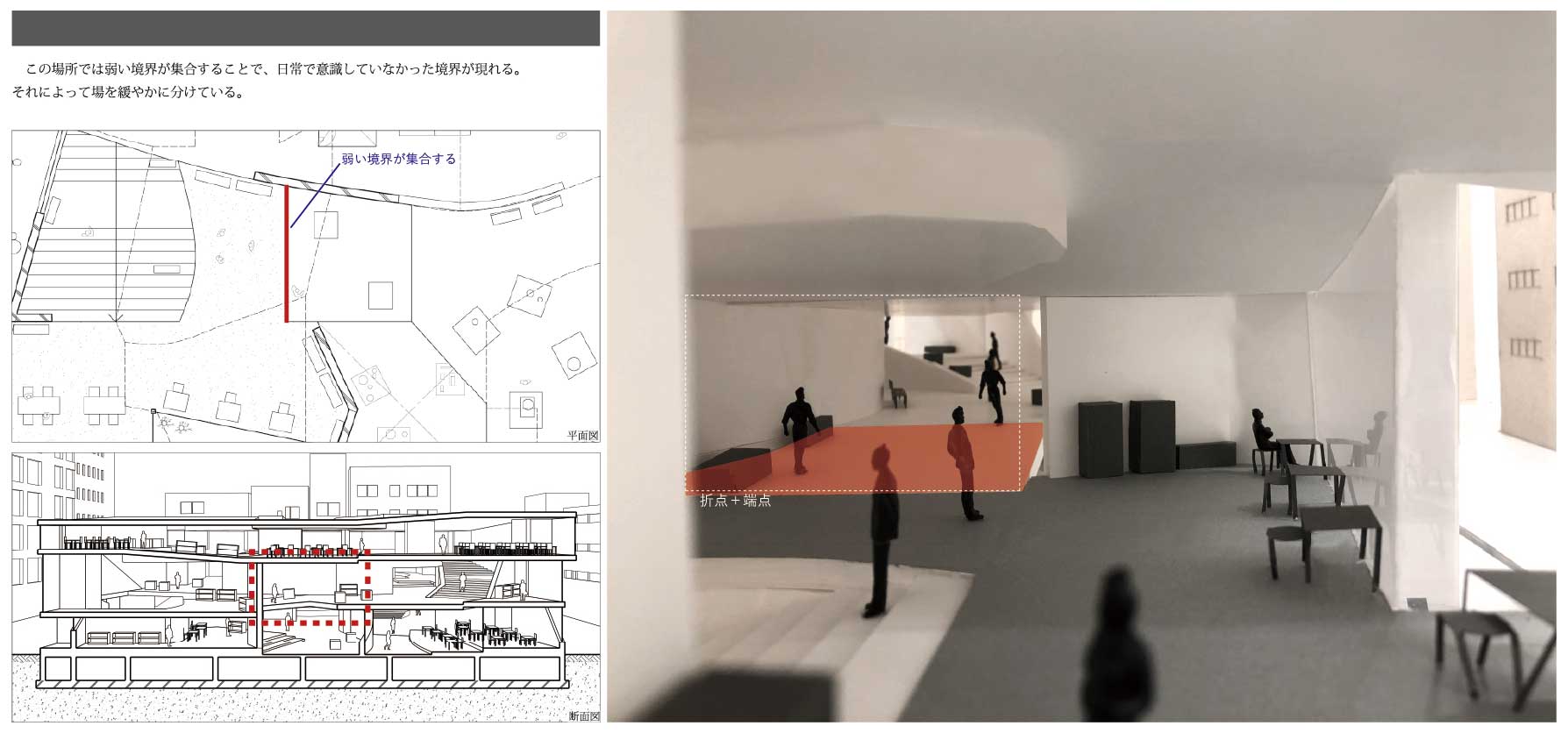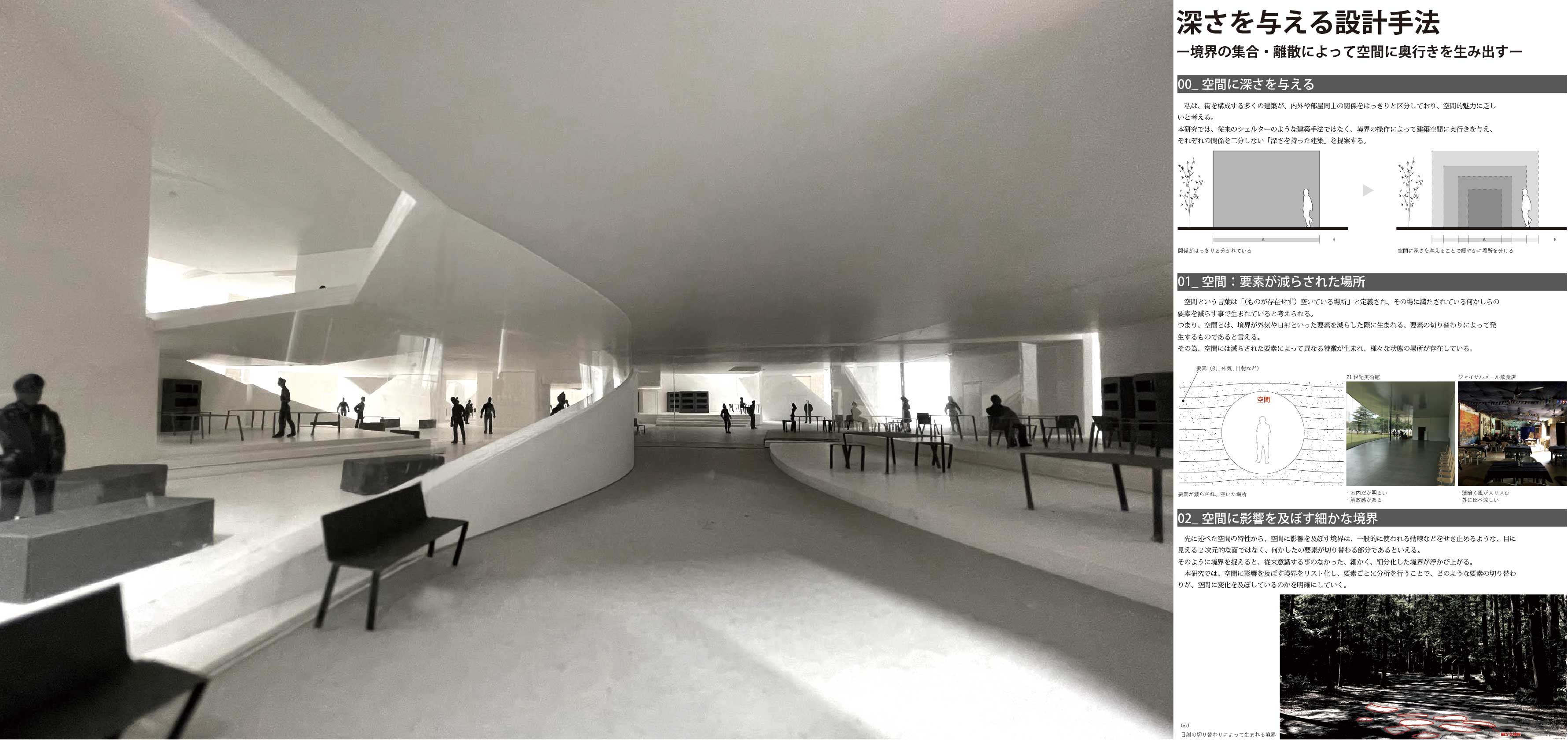 私は、街を構成する多くの建築が内外や部屋同士の関係性をはっきりと区分しており、空間的な魅力に乏しいと考え、細分化した境界を連続させることで生まれる、奥行きのある空間によって、関係性を緩やかに繋げる「深さを持った建築」を提案する。