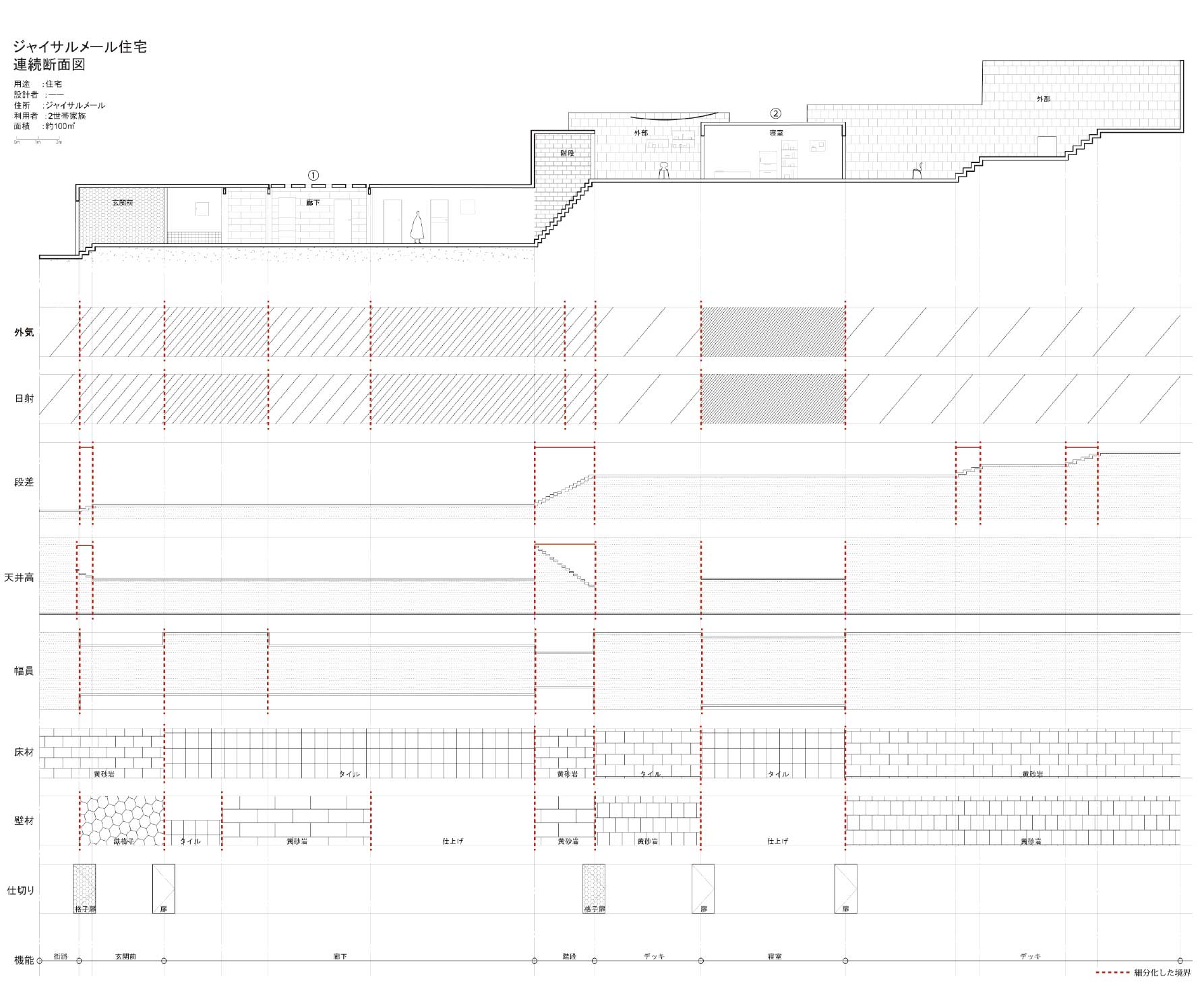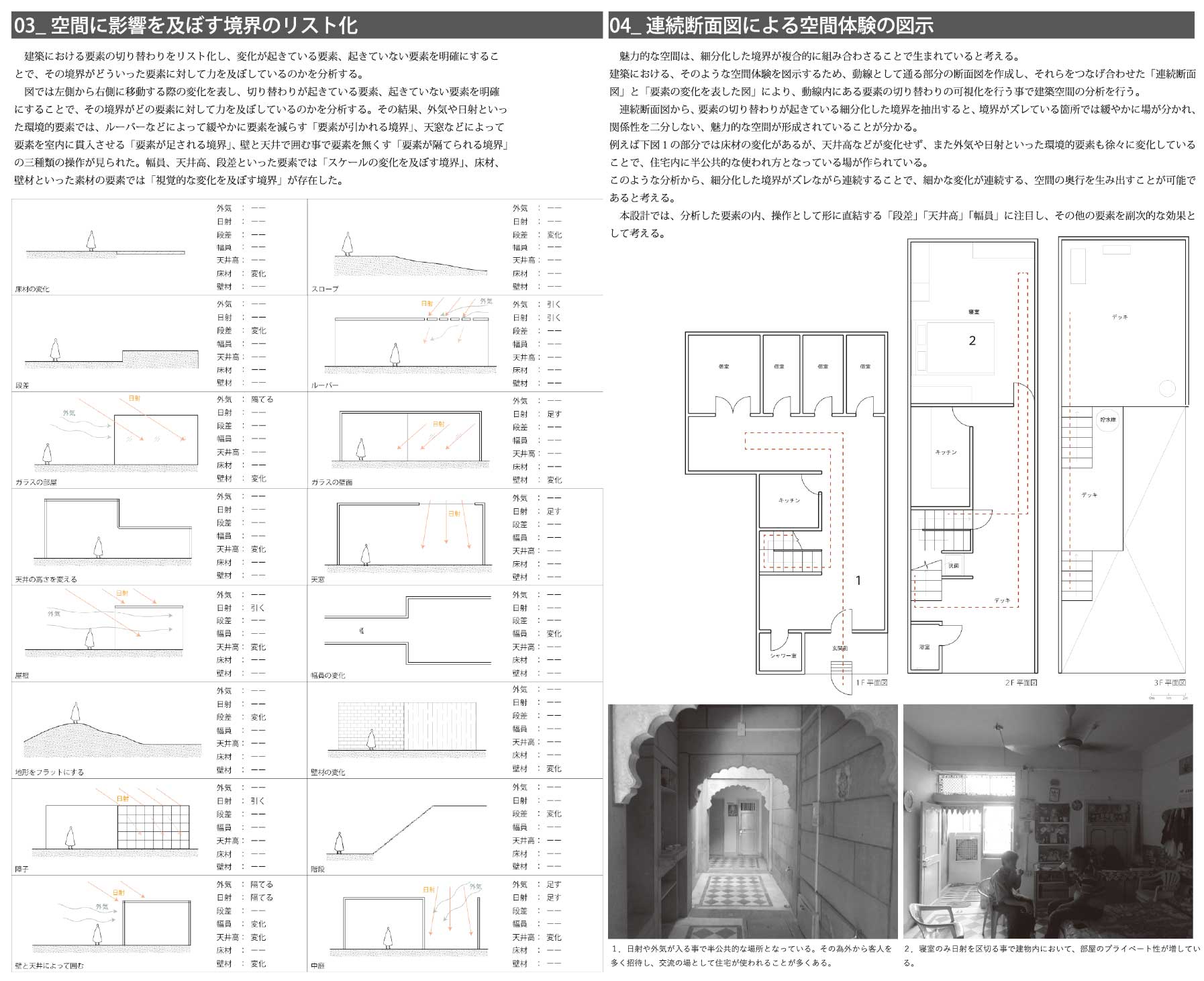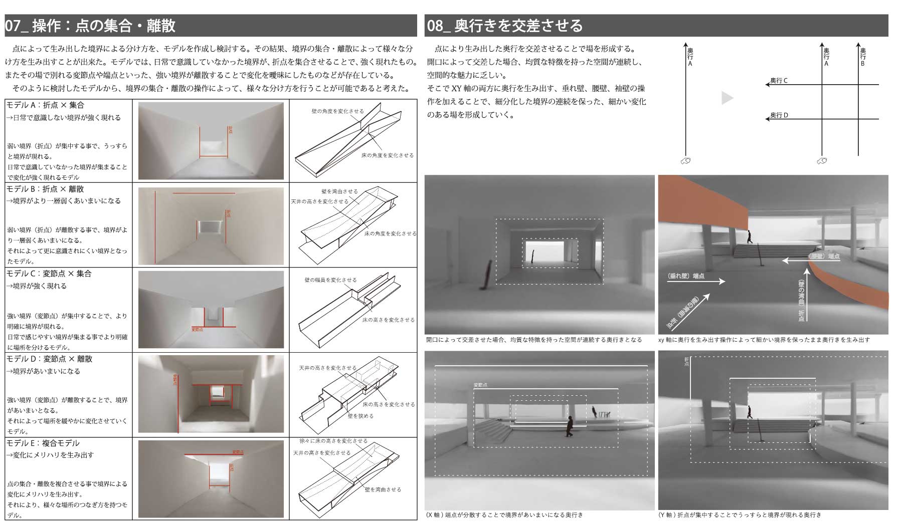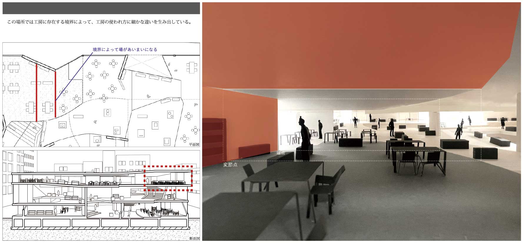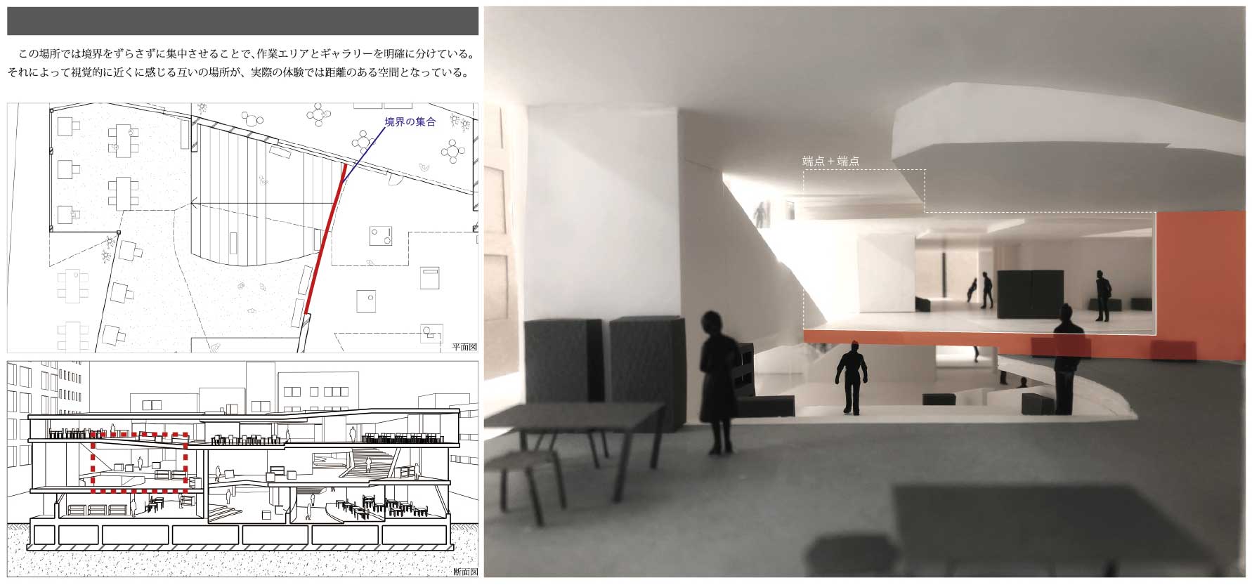 私は、街を構成する多くの建築が内外や部屋同士の関係性をはっきりと区分しており、空間的な魅力に乏しいと考え、細分化した境界を連続させることで生まれる、奥行きのある空間によって、関係性を緩やかに繋げる「深さを持った建築」を提案する。