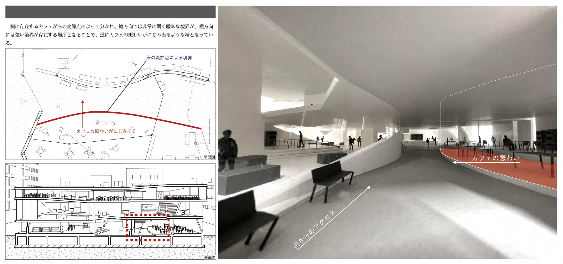 本設計では、街区の内側にあった生活の繋がりを生み出すポテンシャルに注目し、大通りに面している機能の一部を「深さを持った建築」によって緩やかに繋げた公共施設を提案した。それによって、様々な機能を許容し、関係しあう、街の拠点となるような場所を目指した。