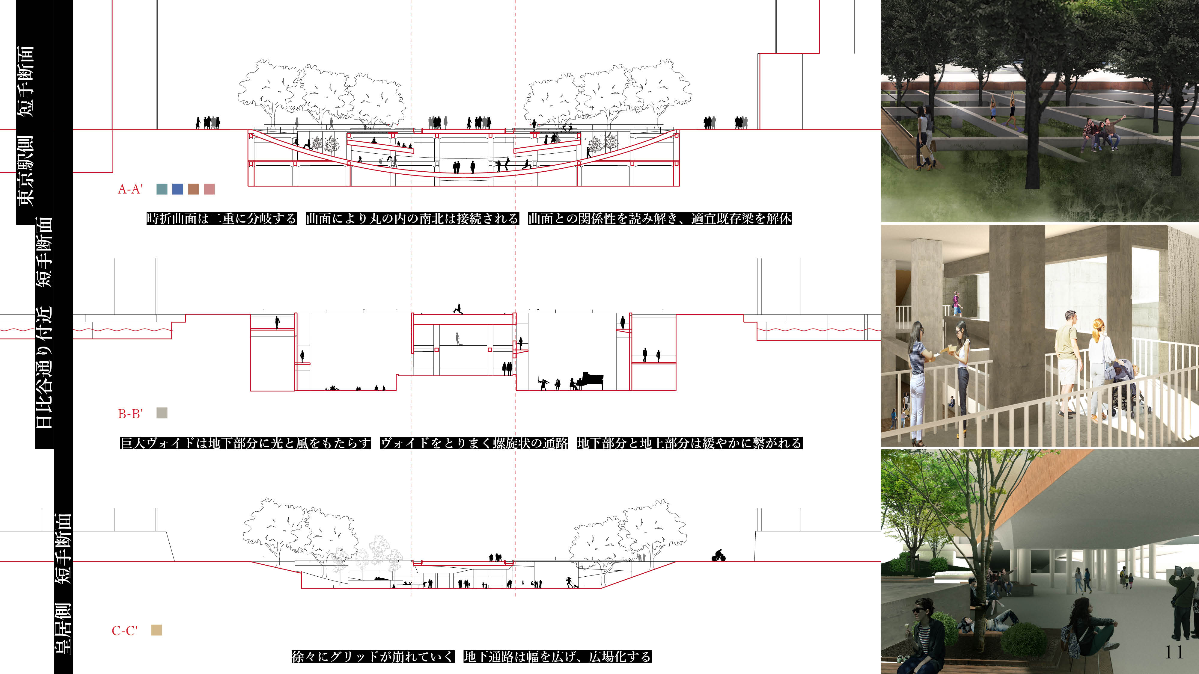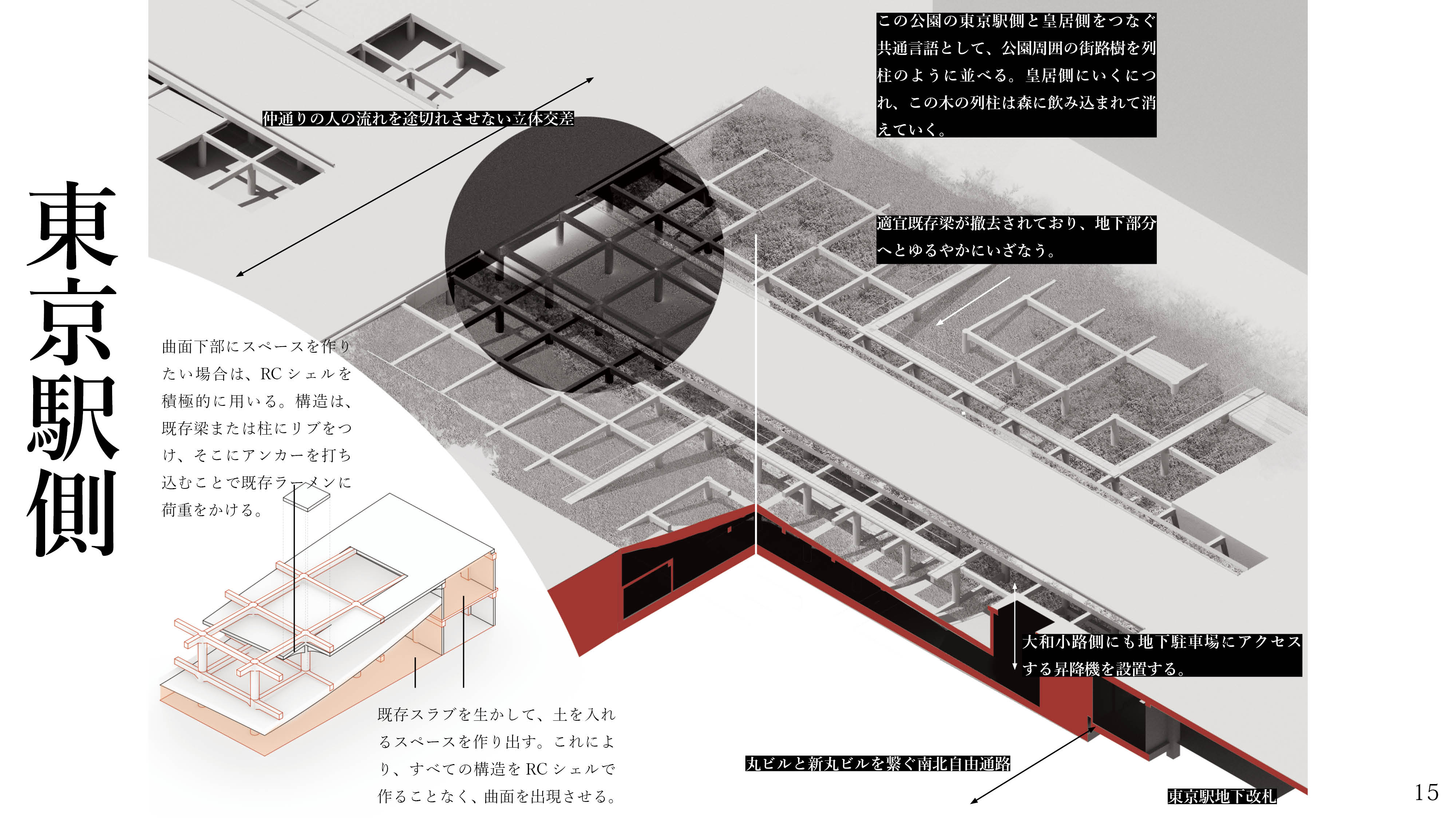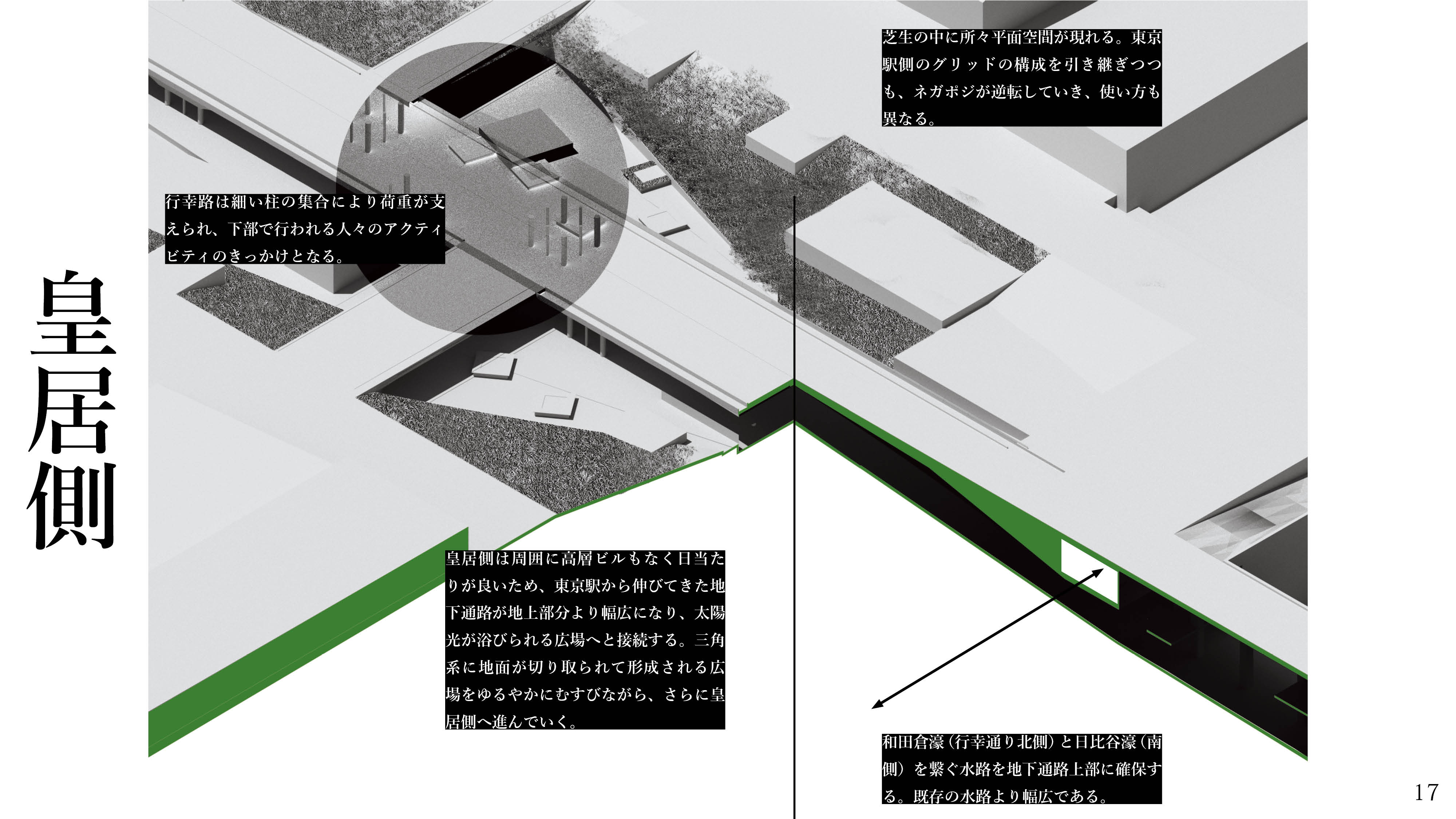 本計画では、行幸通りを、日常的活動の中心と言える丸の内地区と祝祭的活動の中心と言える皇居の2つの要素が相互に貫入しあう巨大円環体として捉え直し、異なる2種の活動が共存する公園「GYOKO PARK」として再計画する。言い換えれば、日常的活動を許容しうる都市の中のモニュメントをつくる試みである。丸の内地区の開発の歴史を踏まえ、地下に眠るグリッド状の構造体に新しい曲面を挿入する形で、2つの大きな言語の相互補完により紡がれる小さな空間から構成される空間を計画した。中心の行幸路で祝祭的活動が行われているさなか、その下をくぐり抜けるような曲面体では子どもが遊ぶ姿が同時に見られるかもしれない。