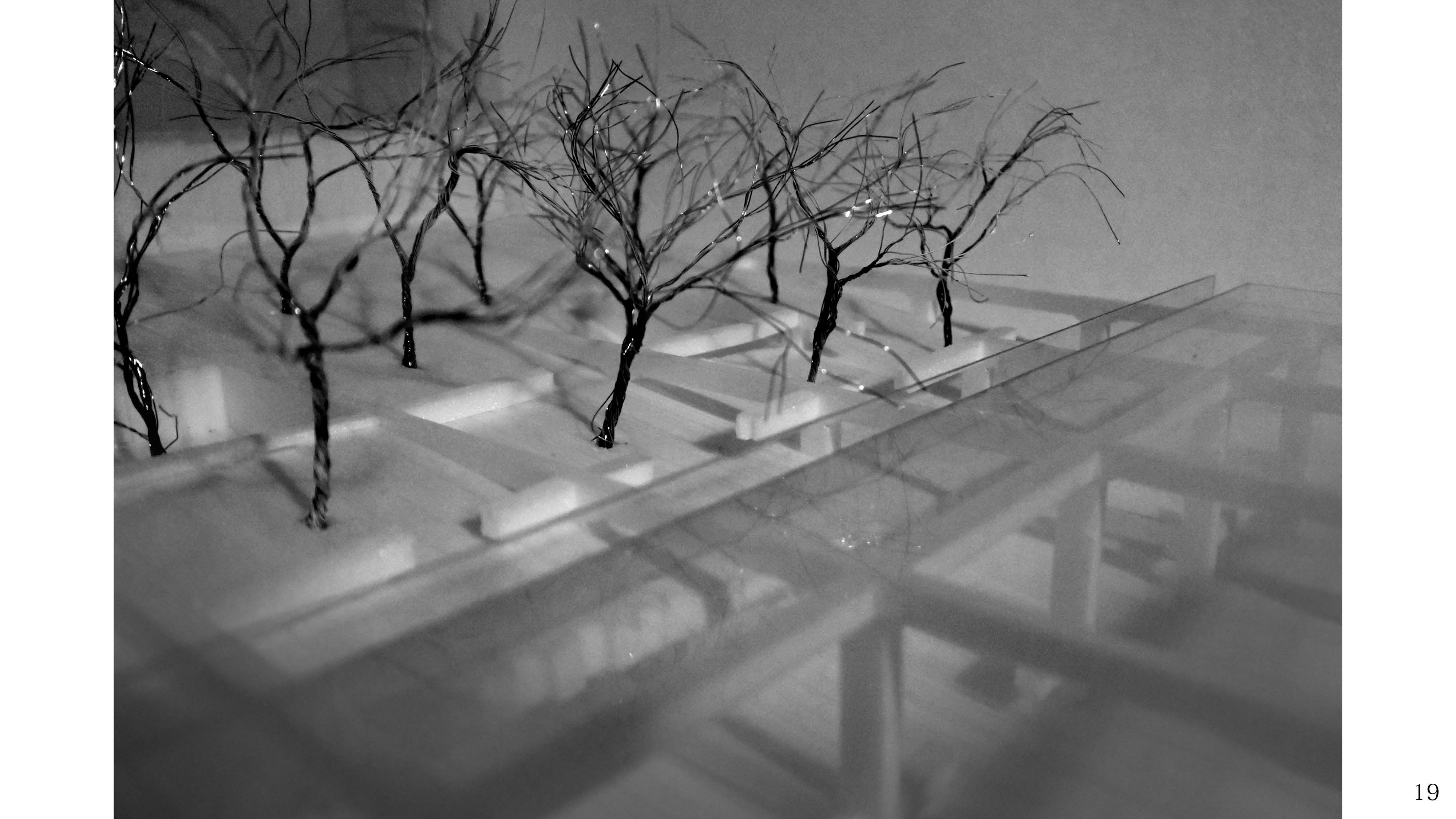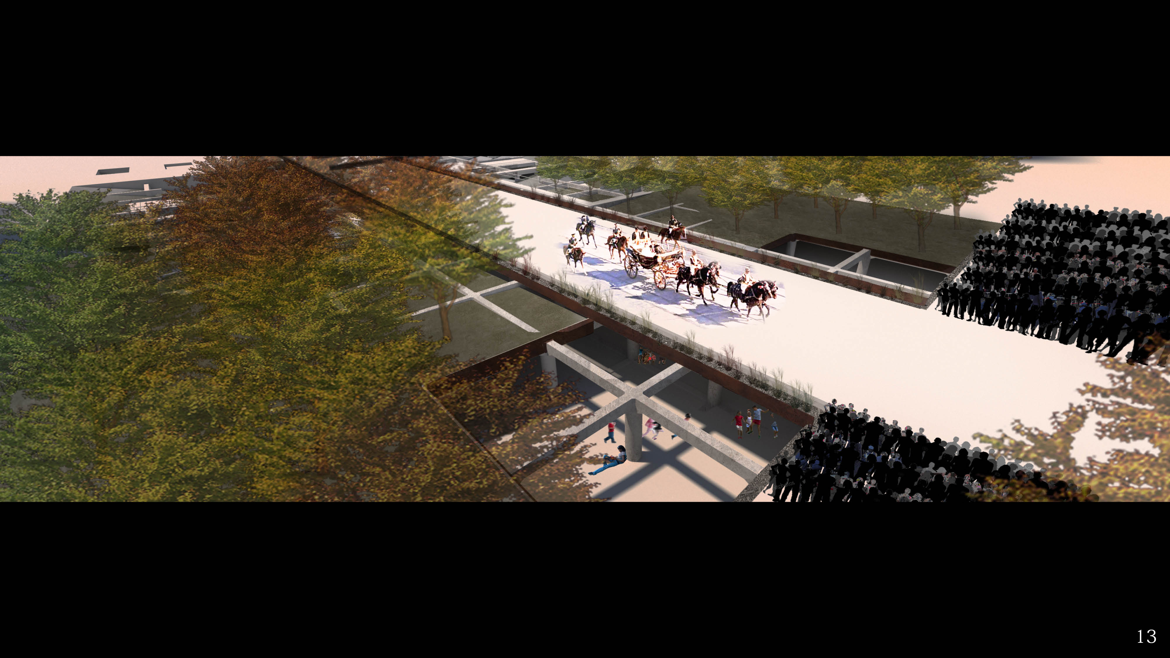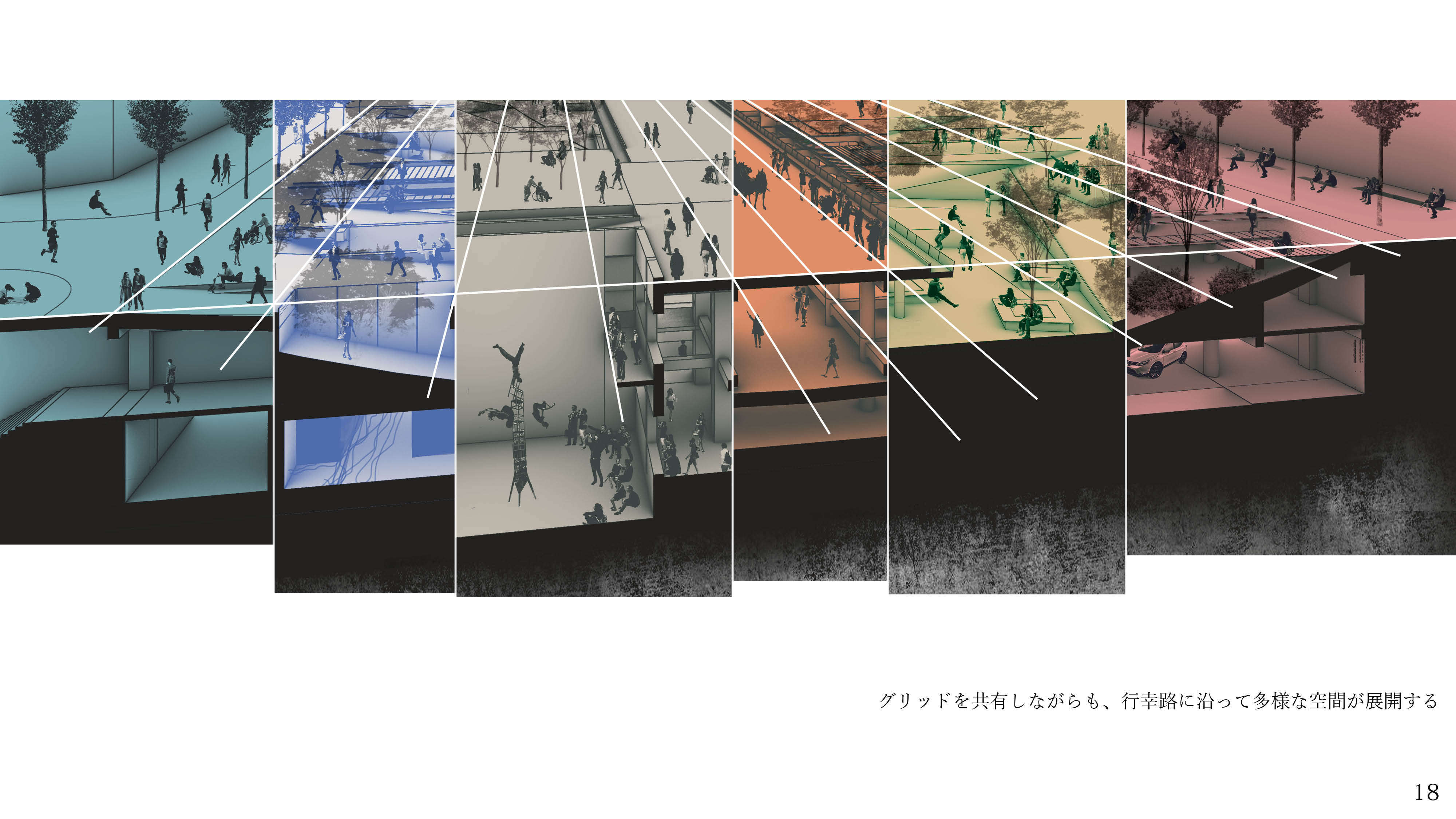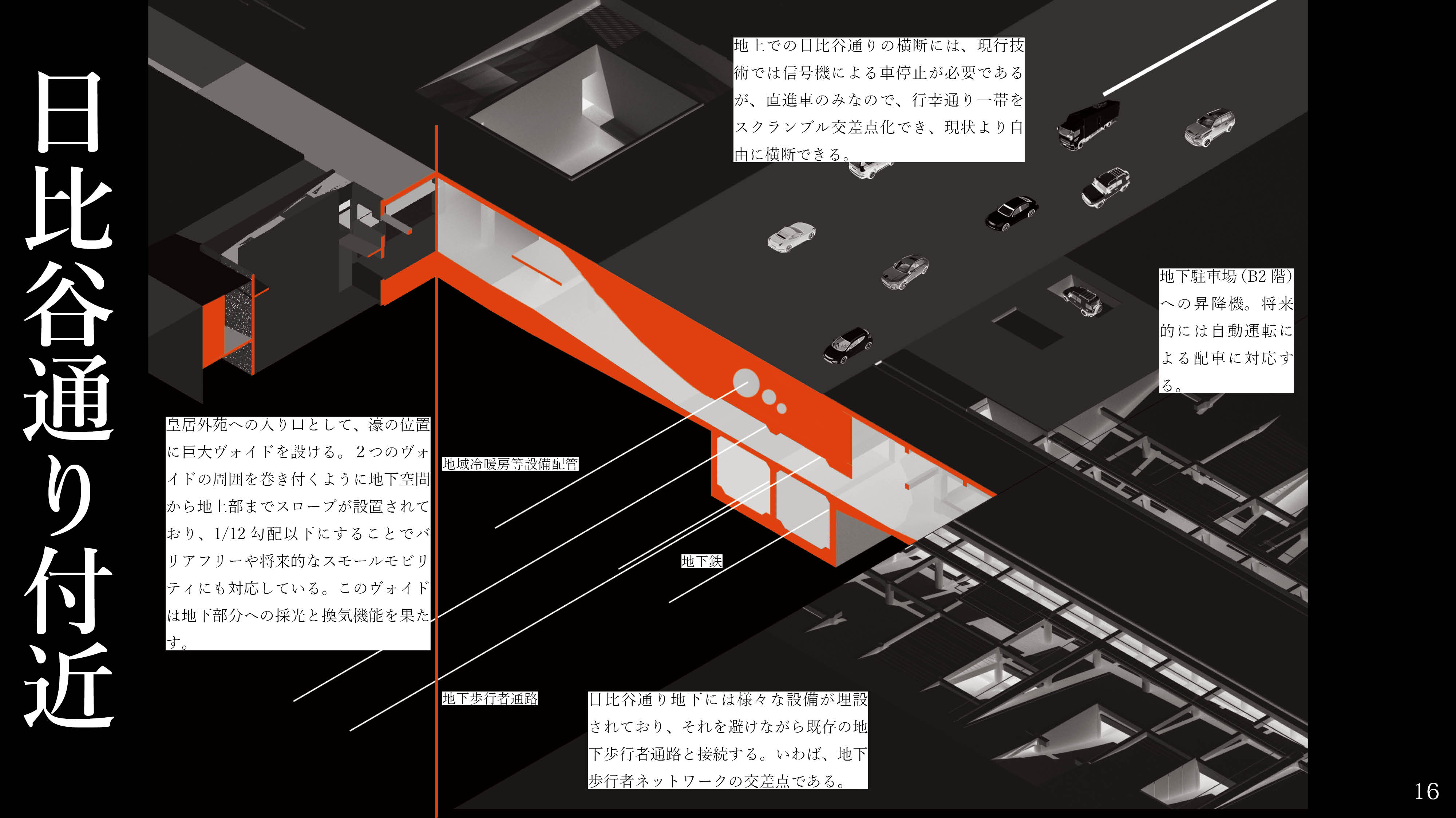 本計画では、行幸通りを、日常的活動の中心と言える丸の内地区と祝祭的活動の中心と言える皇居の2つの要素が相互に貫入しあう巨大円環体として捉え直し、異なる2種の活動が共存する公園「GYOKO PARK」として再計画する。言い換えれば、日常的活動を許容しうる都市の中のモニュメントをつくる試みである。丸の内地区の開発の歴史を踏まえ、地下に眠るグリッド状の構造体に新しい曲面を挿入する形で、2つの大きな言語の相互補完により紡がれる小さな空間から構成される空間を計画した。中心の行幸路で祝祭的活動が行われているさなか、その下をくぐり抜けるような曲面体では子どもが遊ぶ姿が同時に見られるかもしれない。