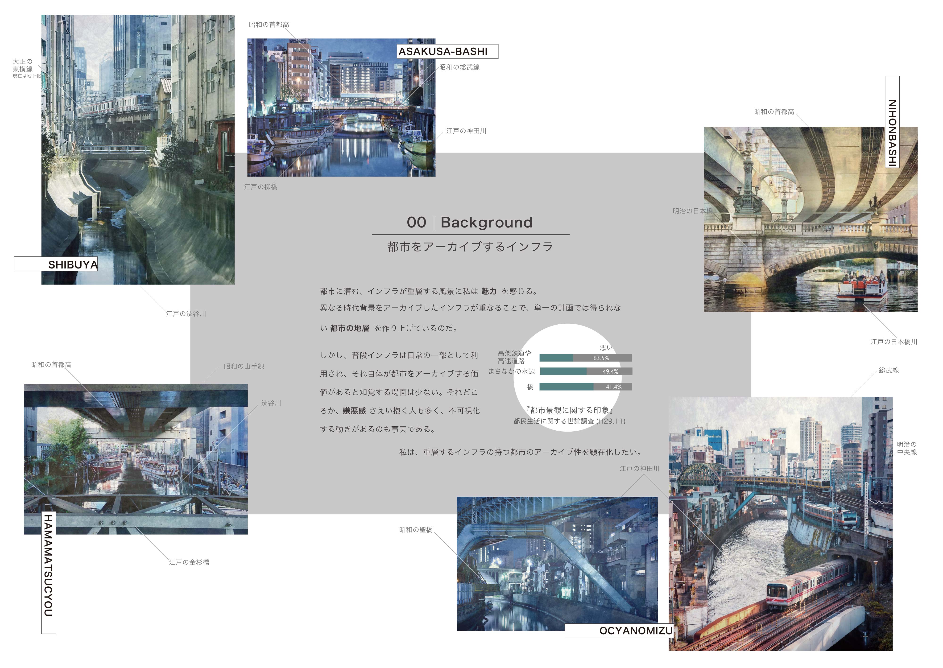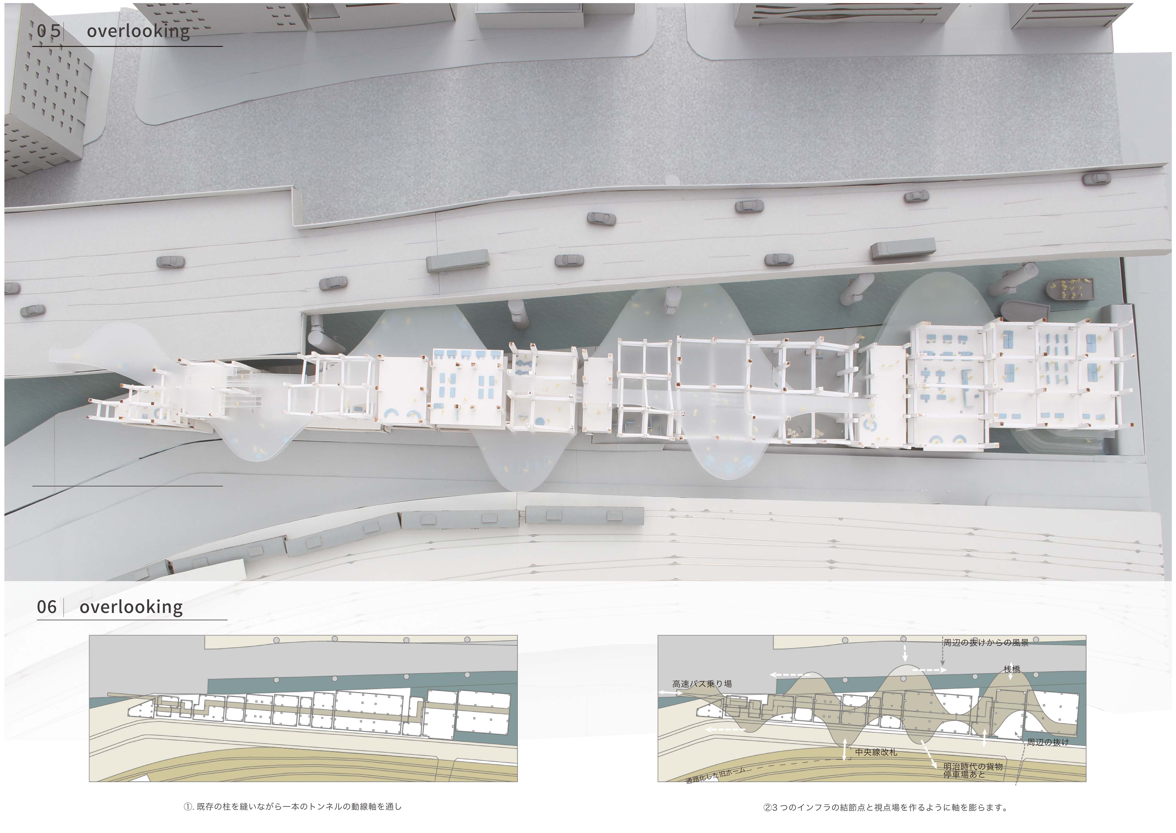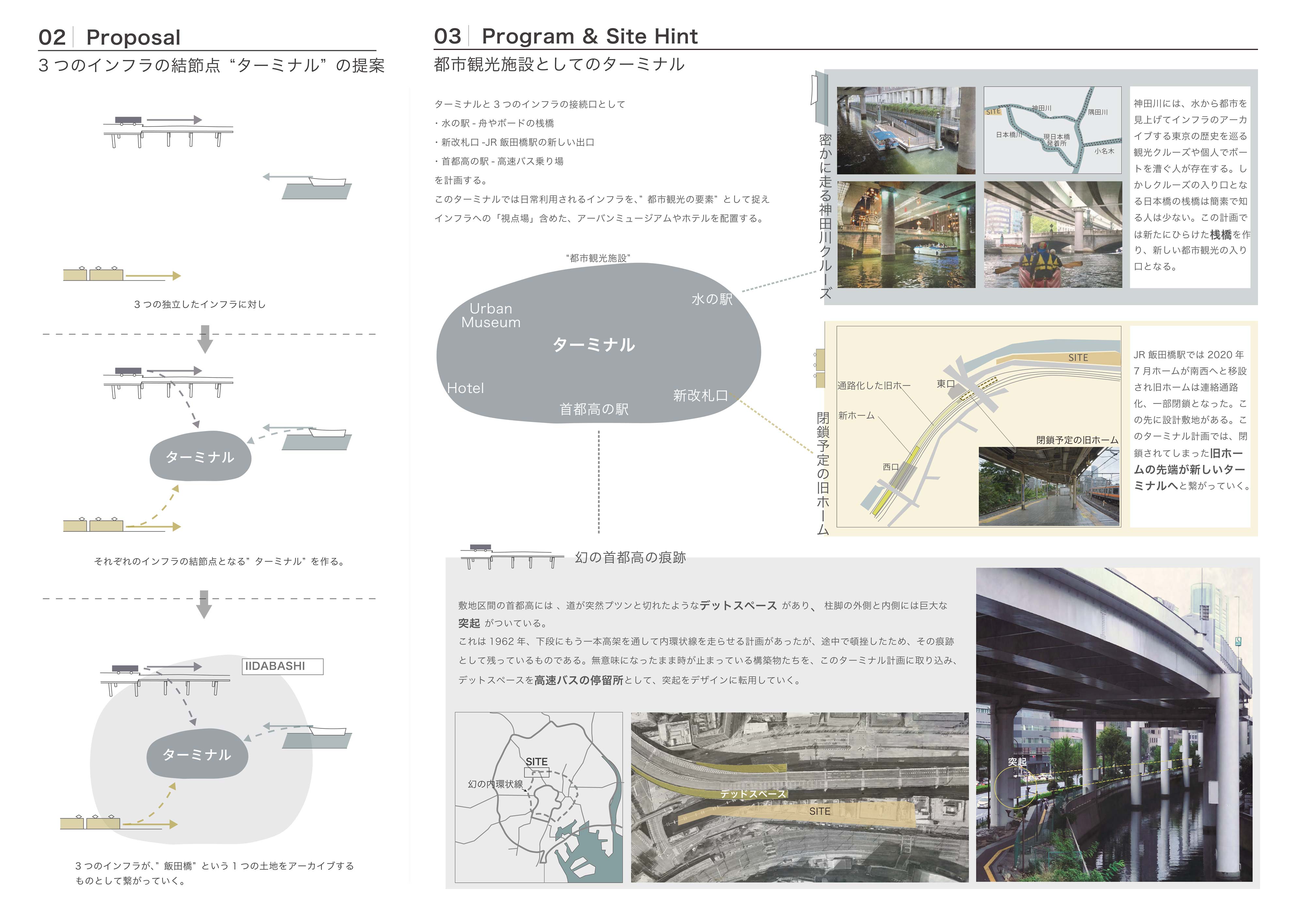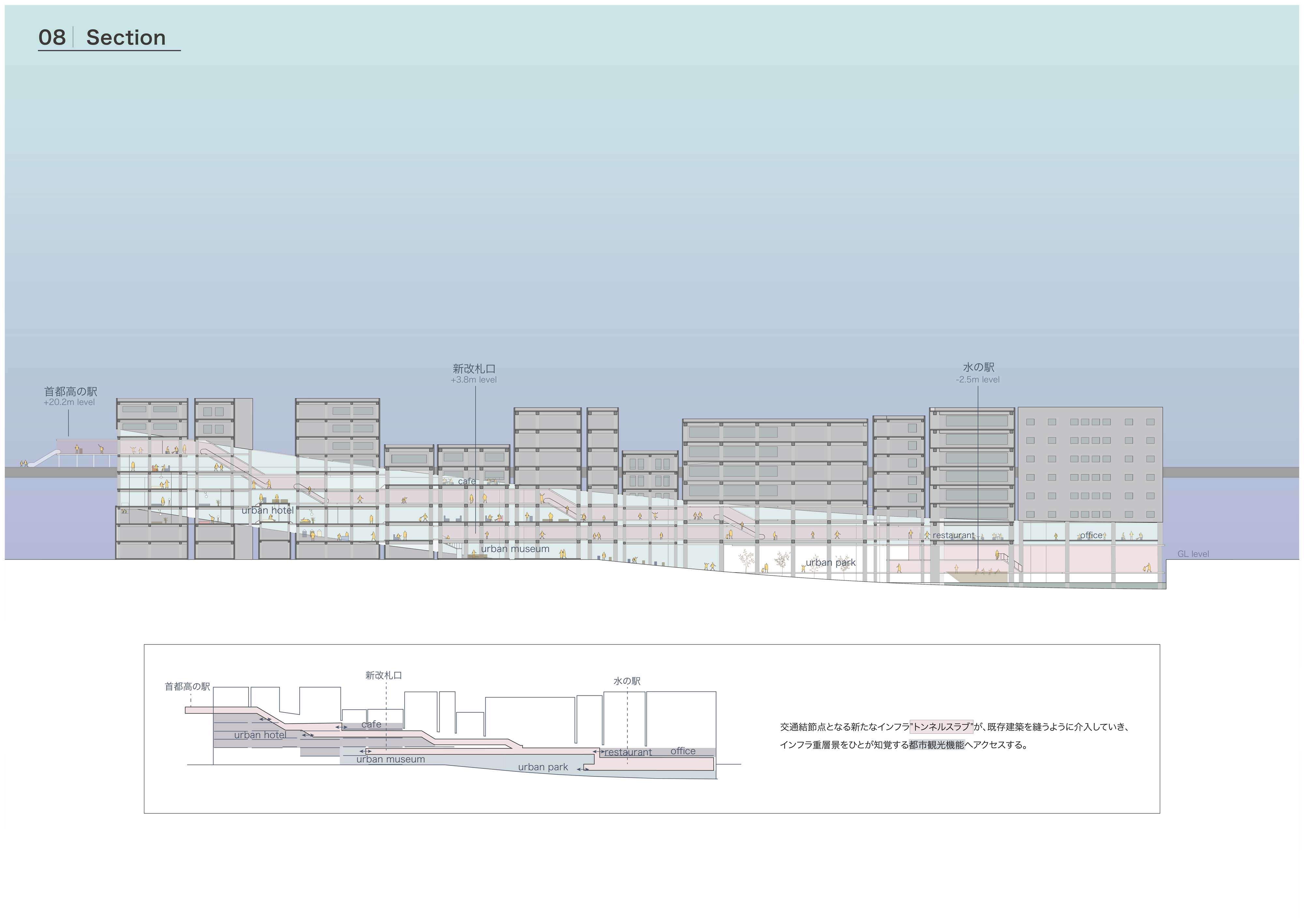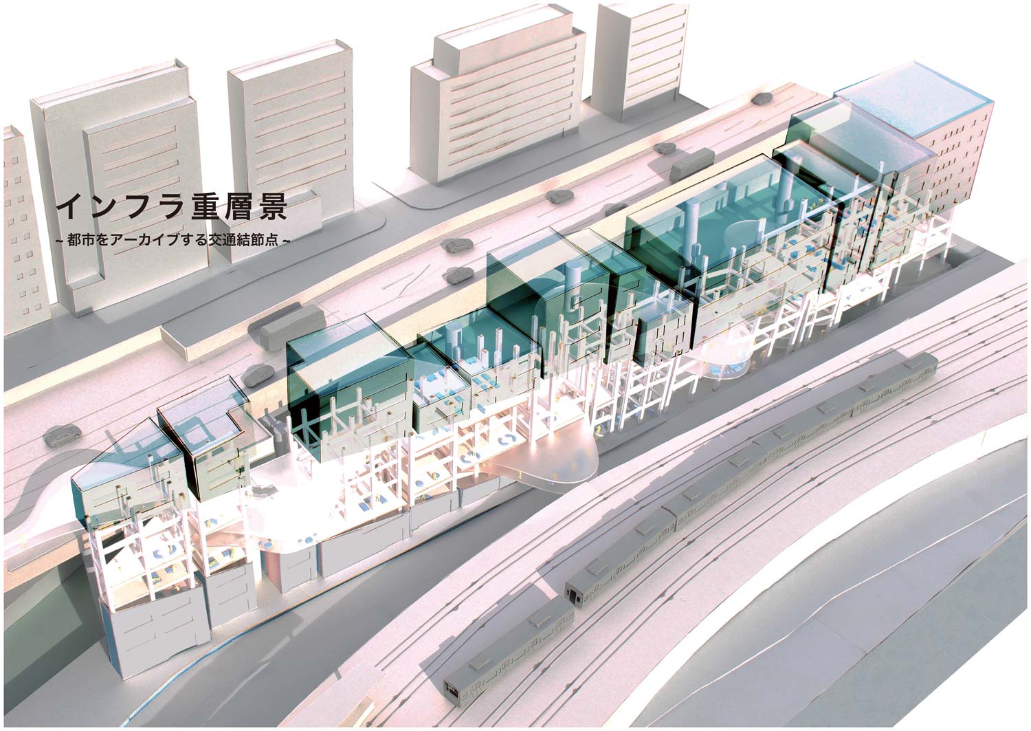 交通インフラが重なる風景はまるで都市の地層のようで、都市をアーカイブする力があると考える。しかし現実は、その景観に嫌悪感を抱く人が多いのが事実である。本提案では、交通インフラの持つ都市のアーカイブ性を建築により顕在化することを目的としている。