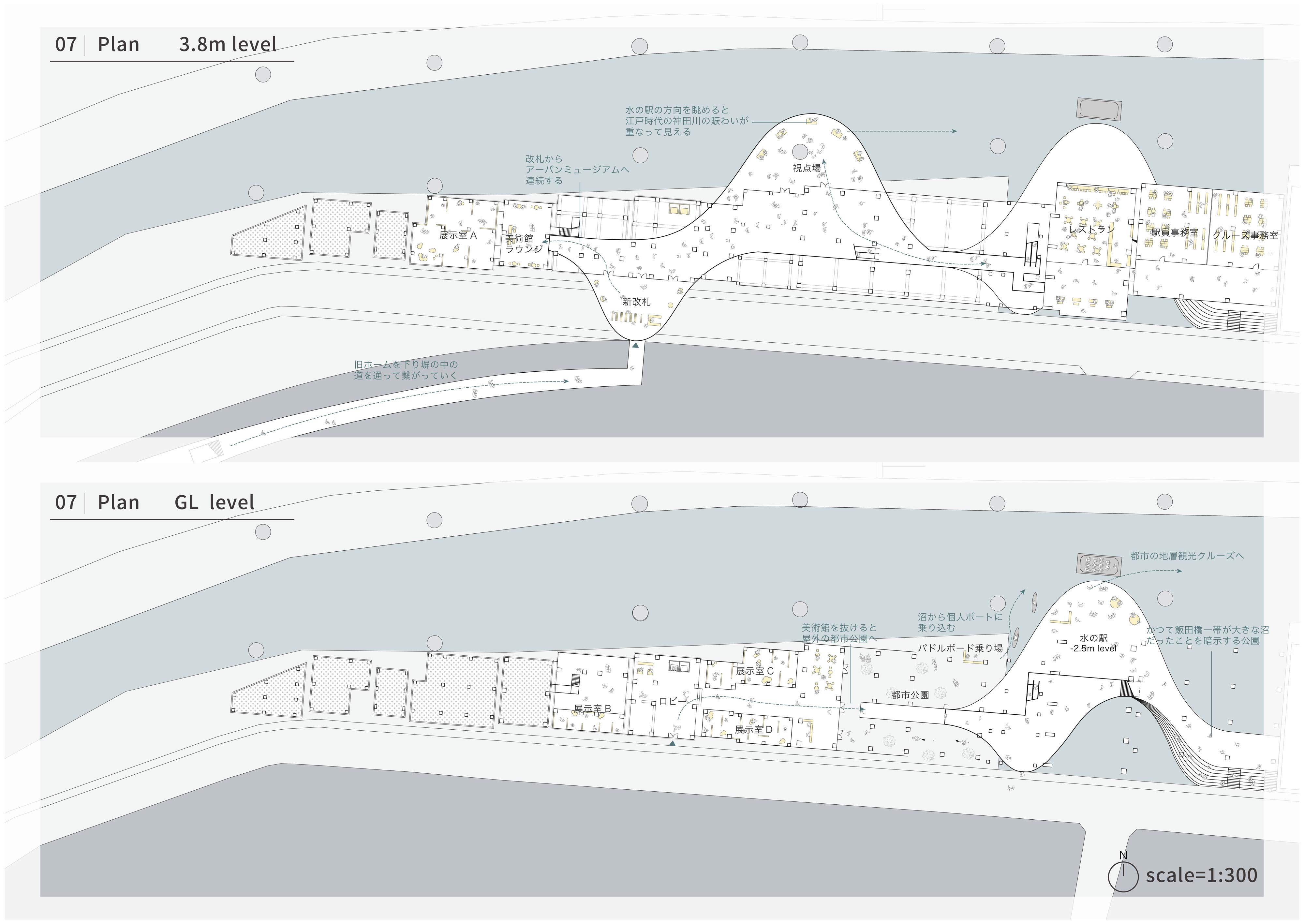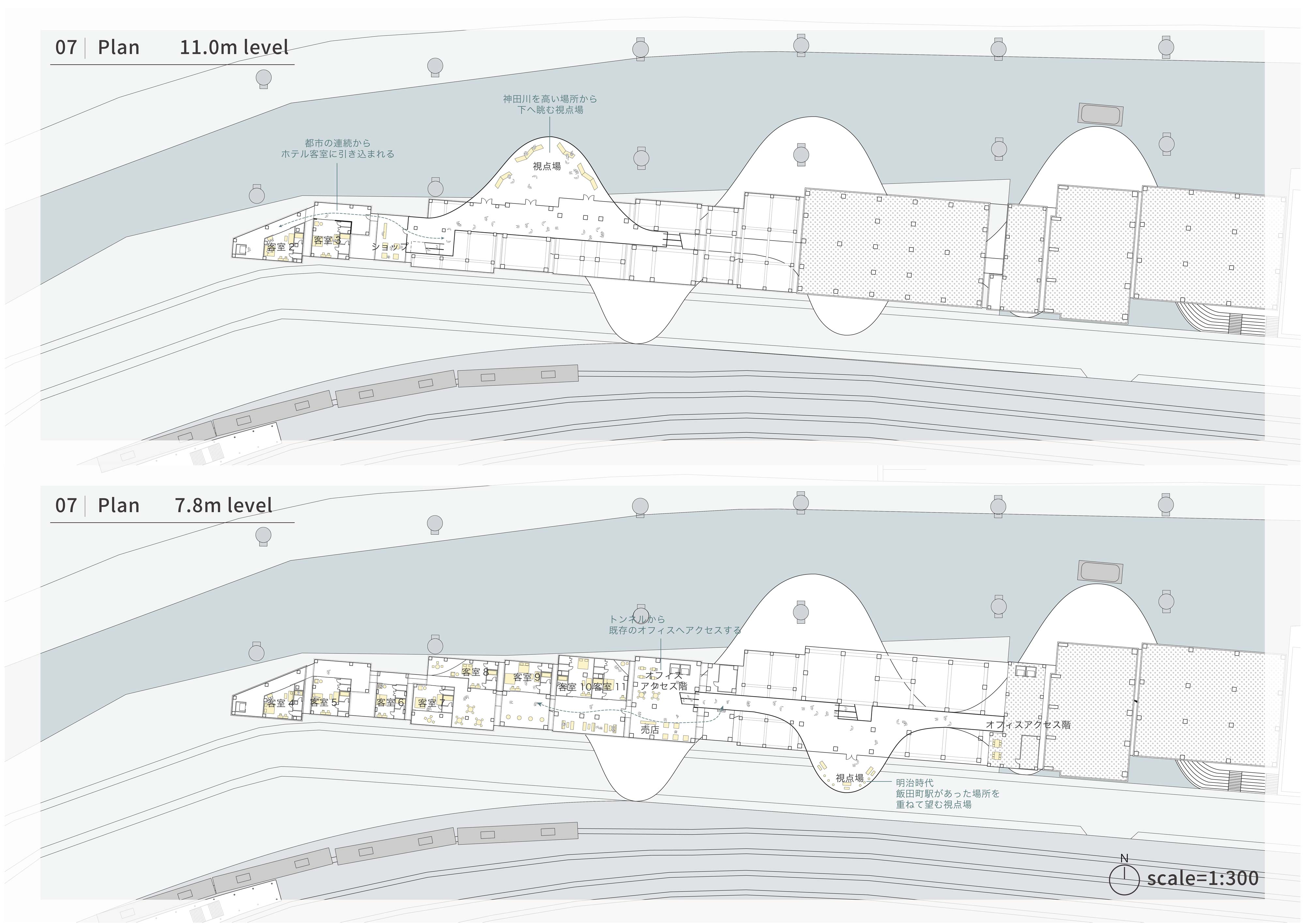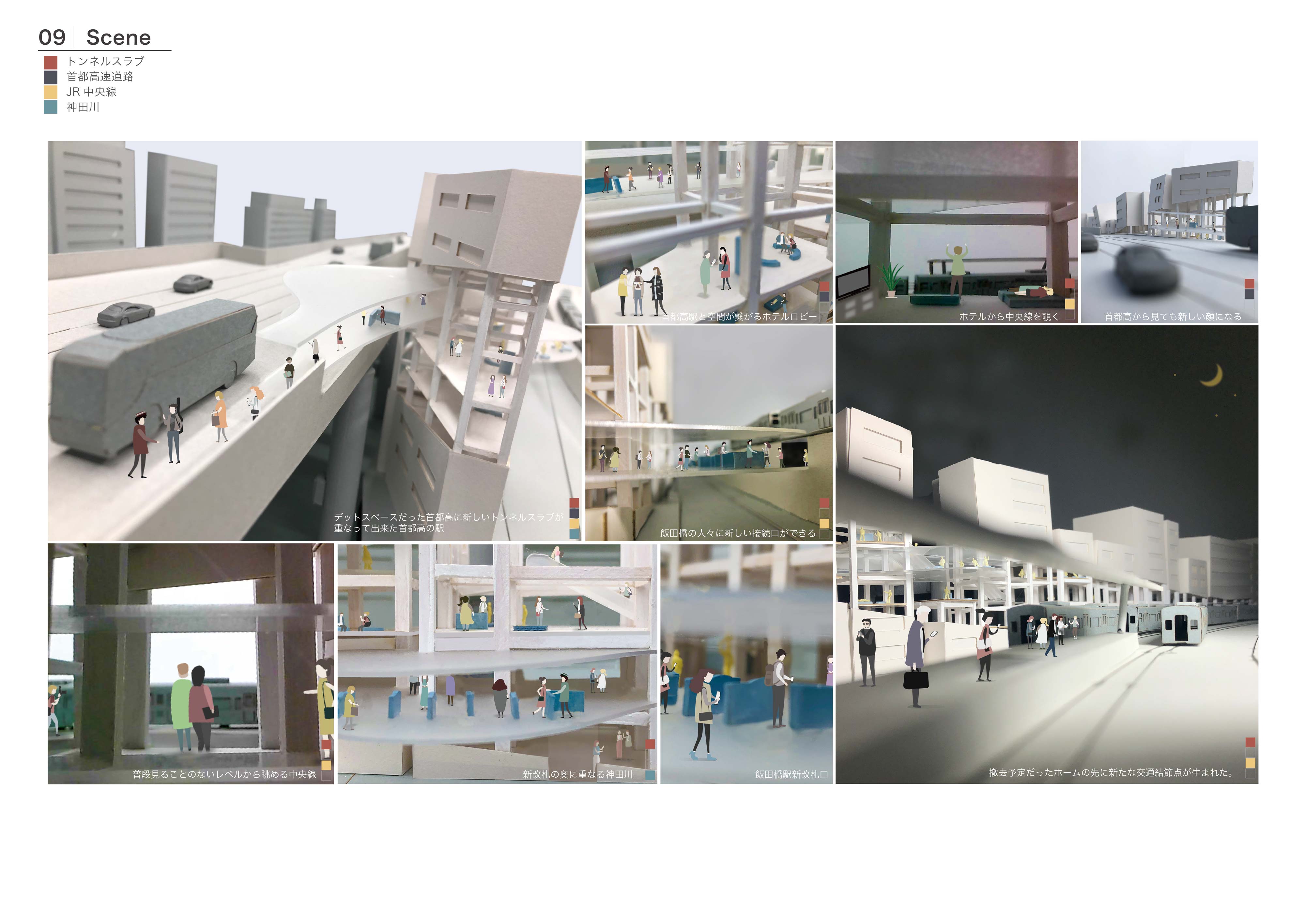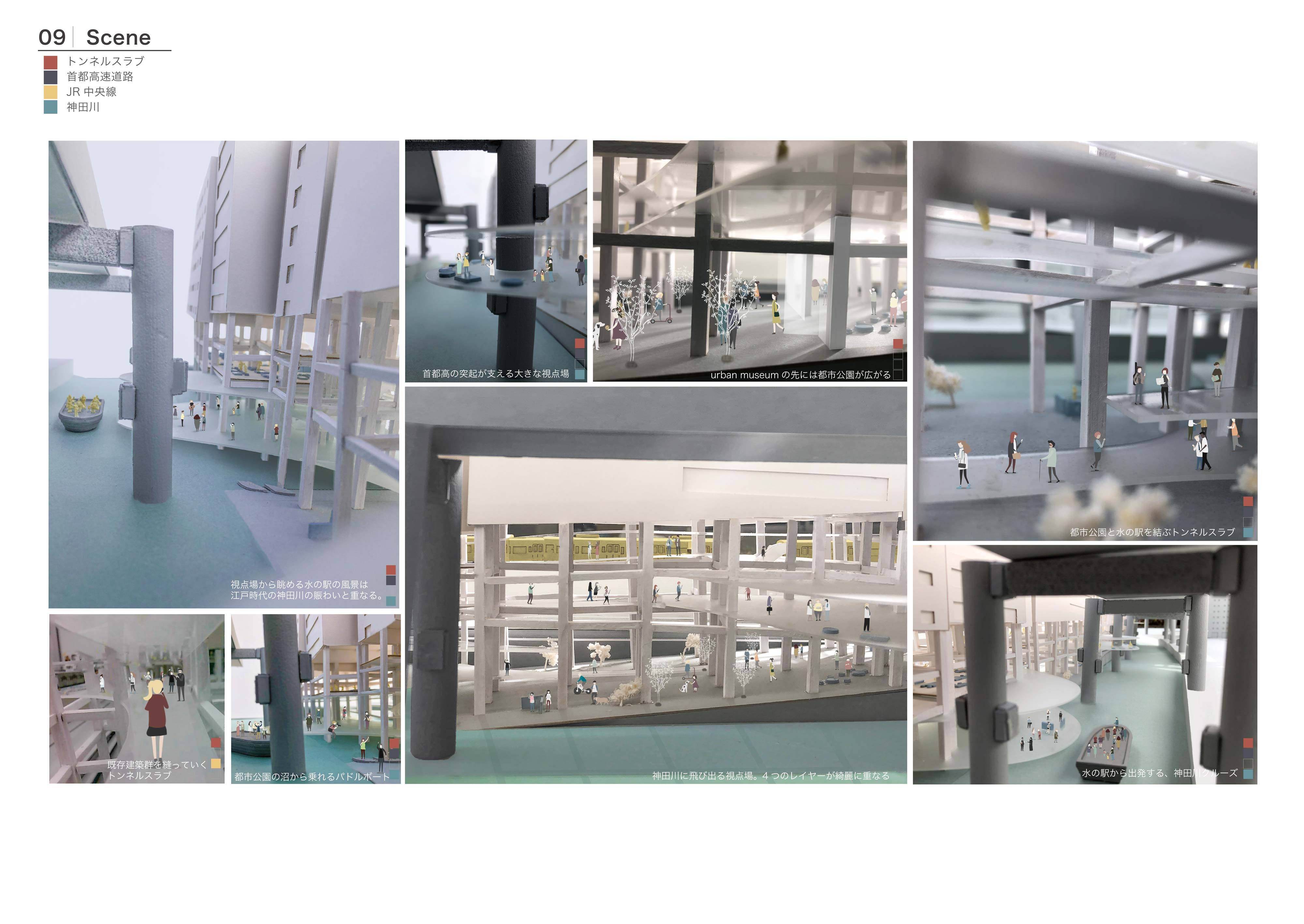 そこで隣接する13棟のビル群を、この区間を通る計画があった幻の内環状線のランプの軌跡をもとに、一連の型で外壁を抜きボイドを作り、地層を顕在化した。そこへ3つのインフラを動線的に結び、人々をこの地層の博物空間へと誘うような交通結節点の役割を果たす新たな波型のインフラを設け、その道中で視点場を設けることでアーカイブされた風景を眺める空間を作り、また既存ビルのボイド空間にはホテルや美術館などを設け、この新たなインフラからアクセスできるようになっている。このようにして、交通インフラの景観を観光資源として読み替えた、新たな都市観光施設を提案する。