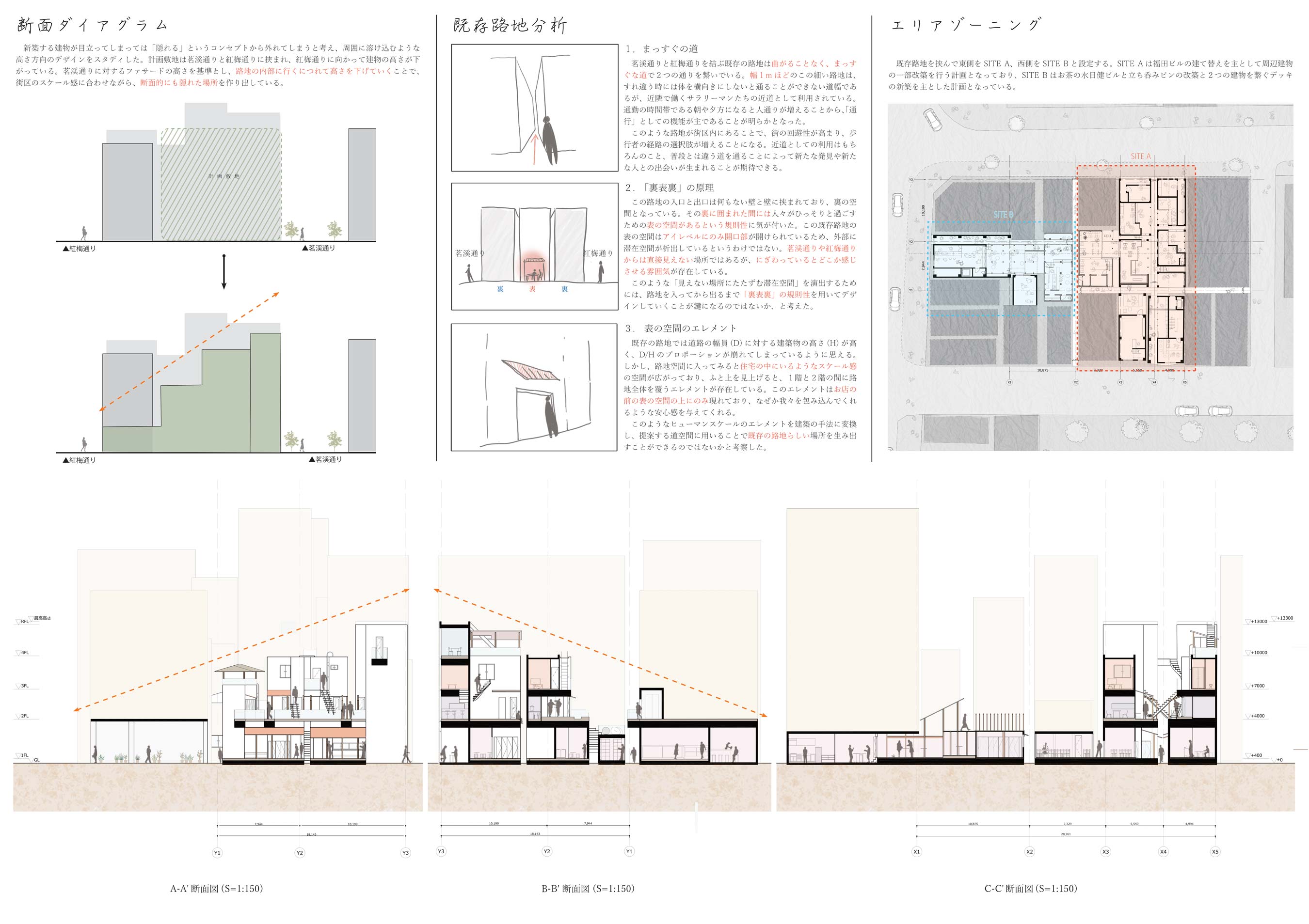 そのような路地空間を茗渓通り、紅梅通り、明大通りの3つの通りに囲まれた街区の中で発見し、この場所を計画敷地として選定した。