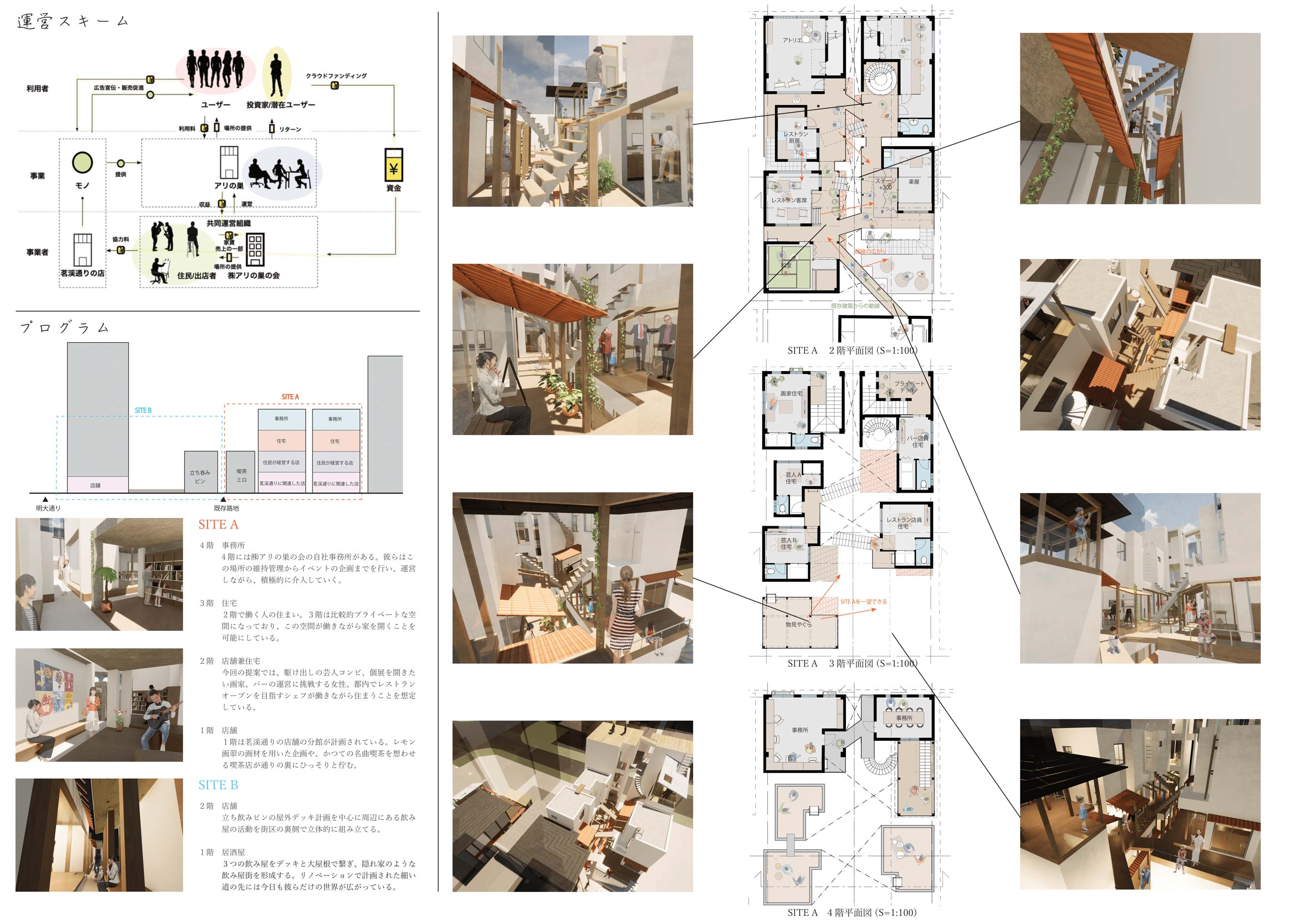 新築とリノベーションを織り交ぜながら、表の茗渓通りからは想像もつかないような空間が街区の中心部にひっそりとたたずんでいるような建築を提案していく。