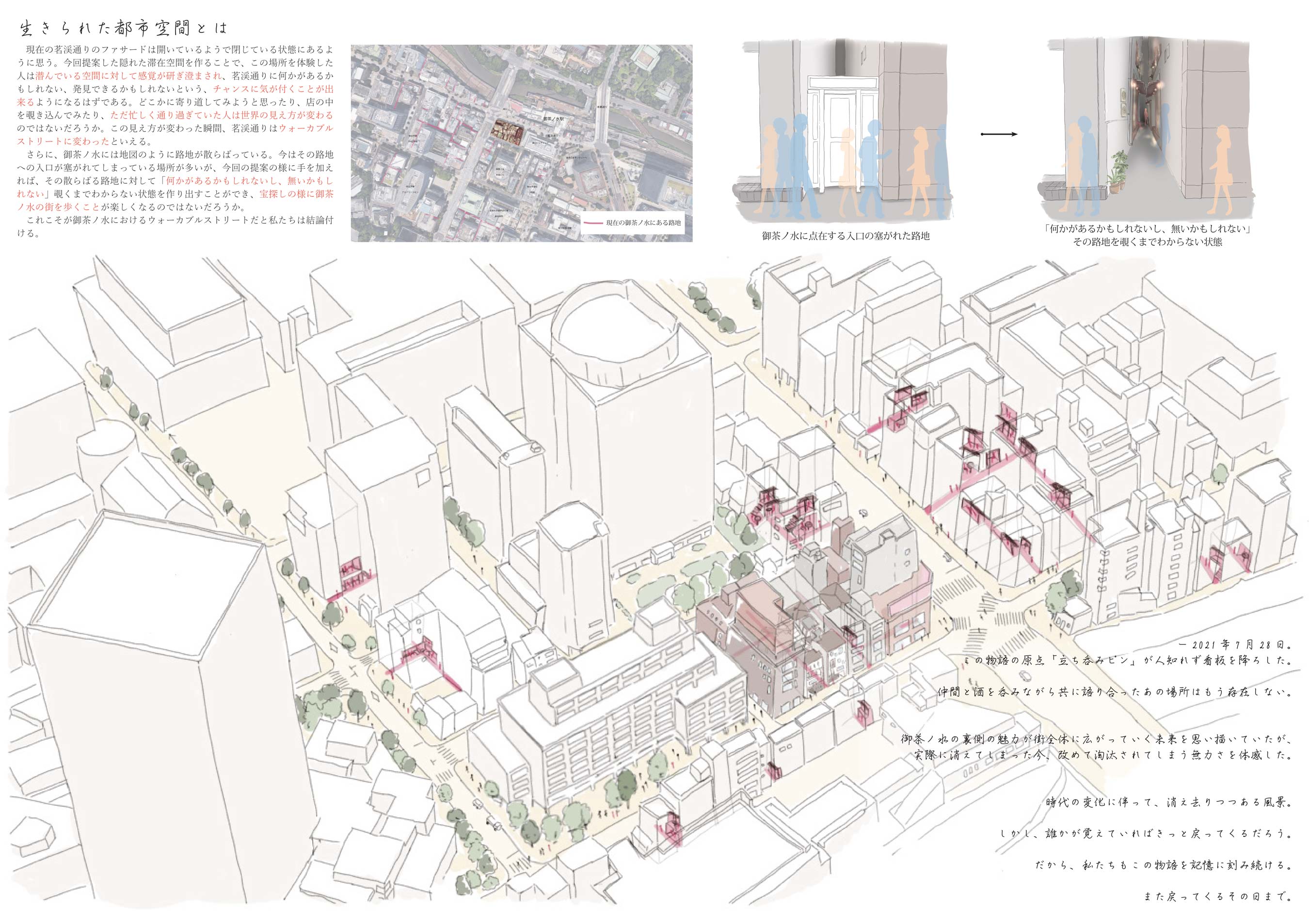 私たちはこの「隠れた滞在空間」を御茶ノ水の本質であると考え、これを建築手法に落とし込むことで、御茶ノ水らしいウォーカブルストリートのあり方を提案できるのではないかと仮定した。