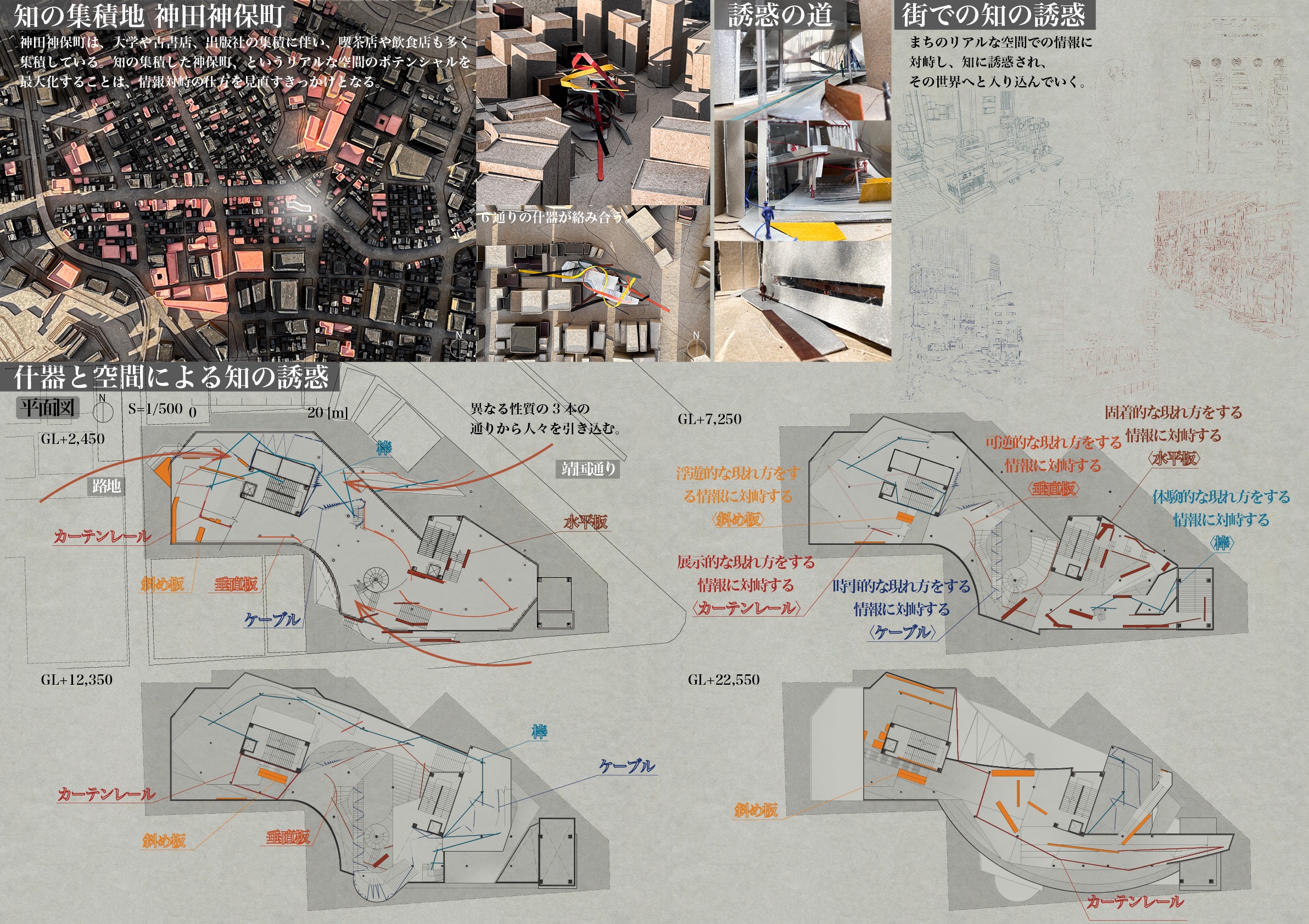 私たちは、眼前に現れる情報に対峙したとき、そこに潜む知に気付き魅了され、のめりこんでいくことがある。しかし、気付くか気付かないか、享受できるかできないかはその人自身に委ねられているのが現状だ。そこで本計画では、社会空間における、「知の気付き方」を、知の集積地である神田神保町にて、提示する。すなわち、情報から知を享受するための無数の入り口を指し示し、知に潜む引力を、最大化するのだ。
