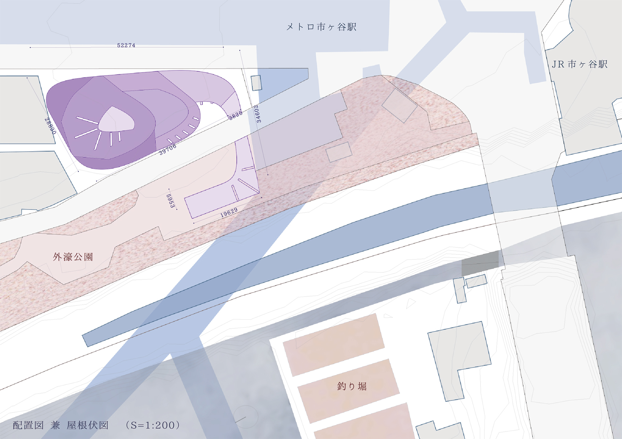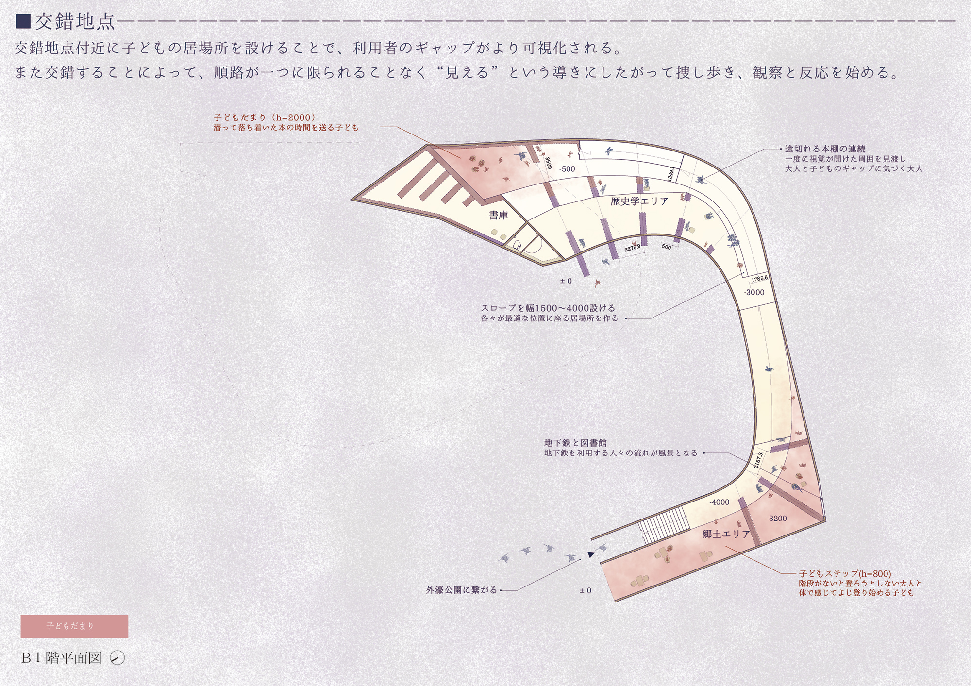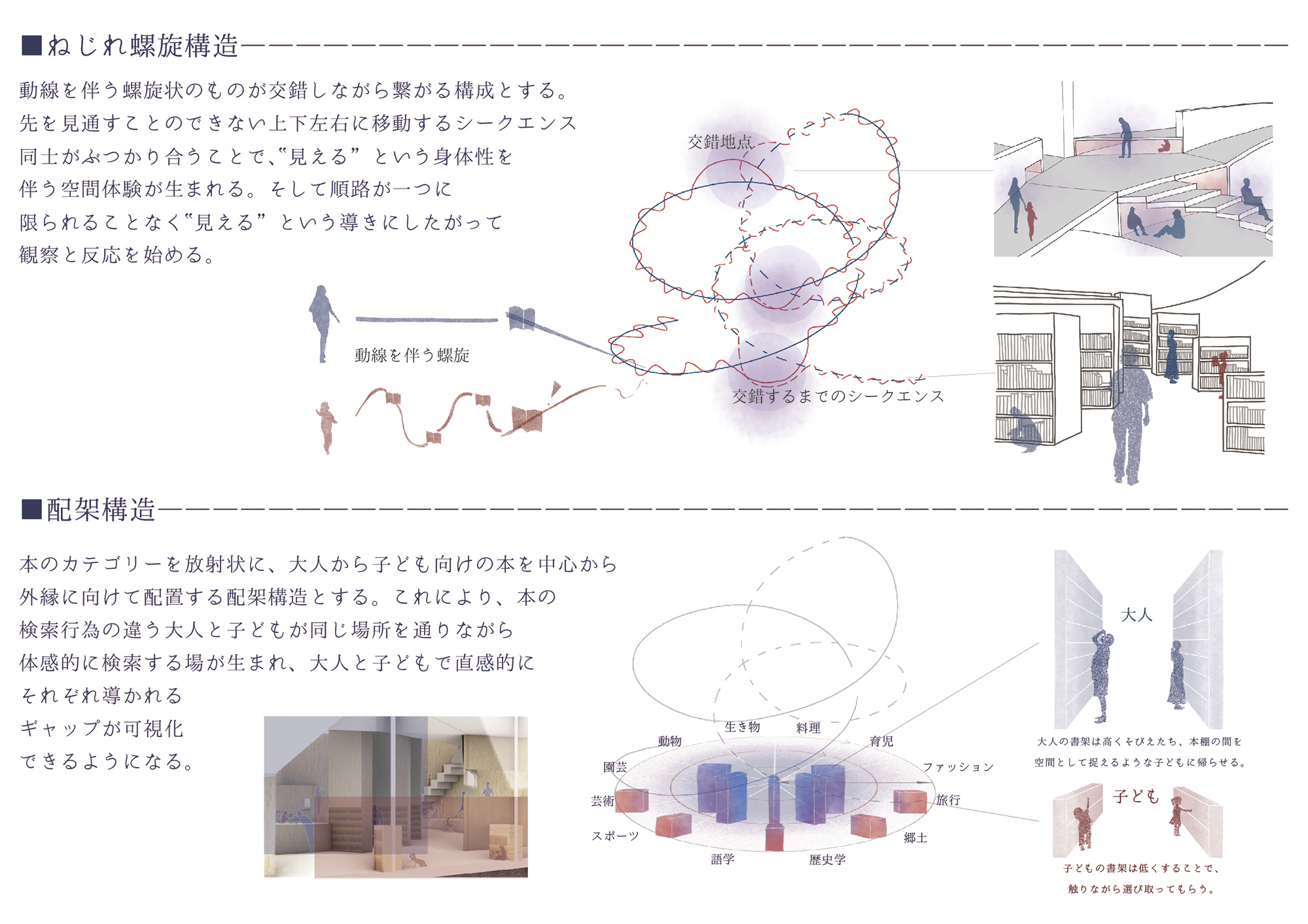 順路が一つに限られることなく‟見える”という身体性を伴う空間体験を生むねじれ螺旋構造と、検索行為の違う大人と子どもが同じ場所を通りながら体感的に検索する場を生む配架構造の両面から考え、起伏のある市ヶ谷駅周辺を引き込みながら、大人と子ども、知と身体を繋いでいくことで、新たな発想が発芽する場となる。そして体験は図書館にとどまらず、公園、外濠へと広がっていく。