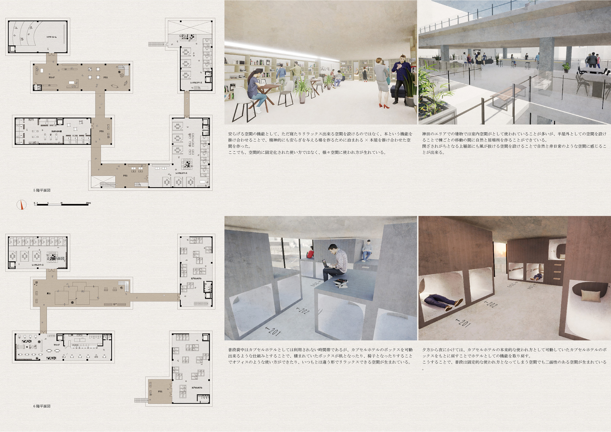 この建築では、既存の道路を挟むようにして中庭空間を持たせることで、道路をより歩行者中心な場所とし、新たな道路を介した活動のきっかけをつくる。建築全体に点在する中庭、テラス、橋空間での多様な活動や、建築内部のレンタルスペースや各施設によって、仕事などの日常的な利用と、安らぐ空間としての利用を可能としている。自分が思い描く空間、活動が実現できるだろう。