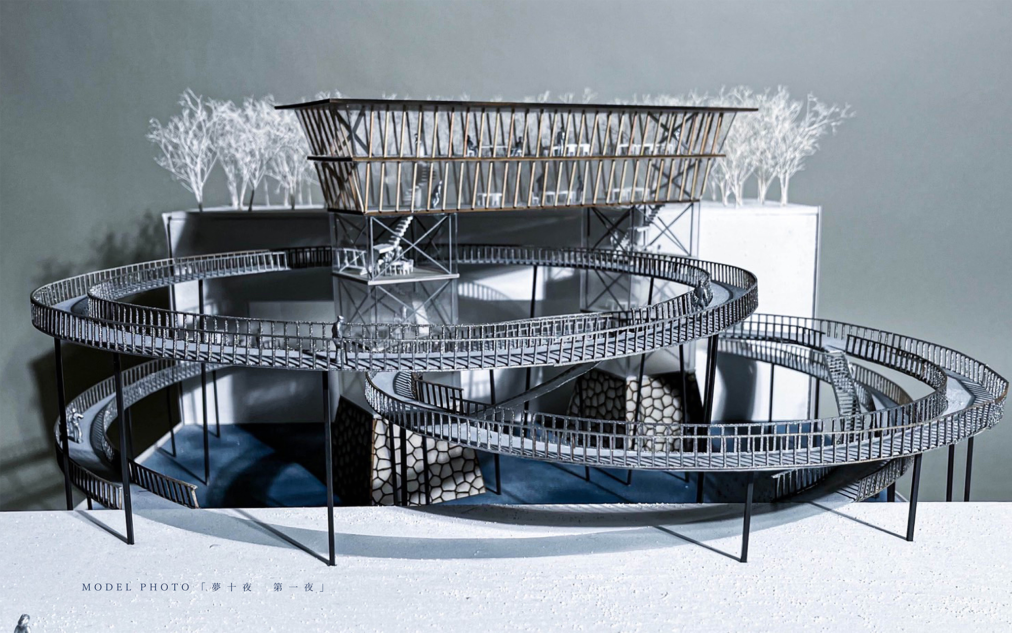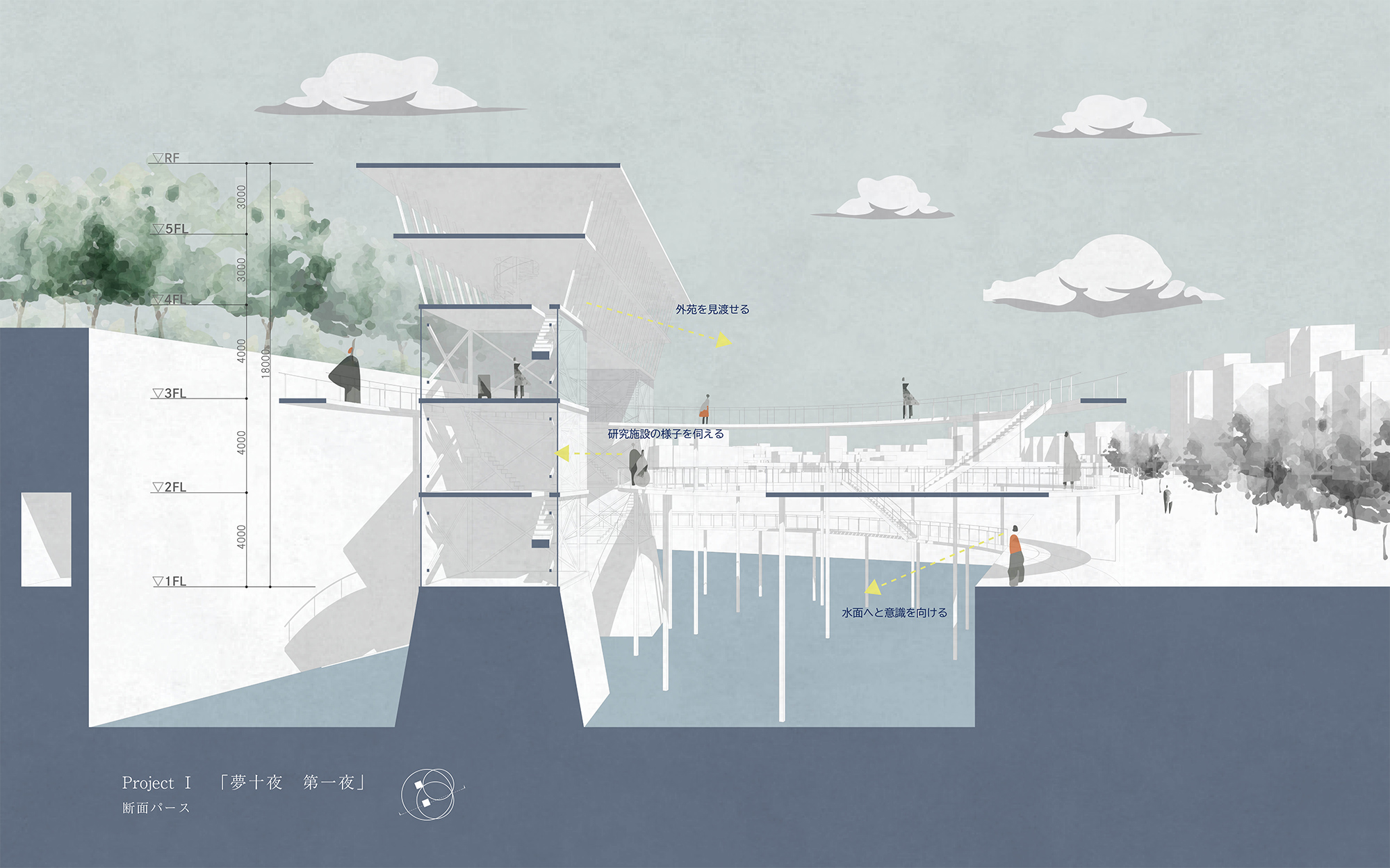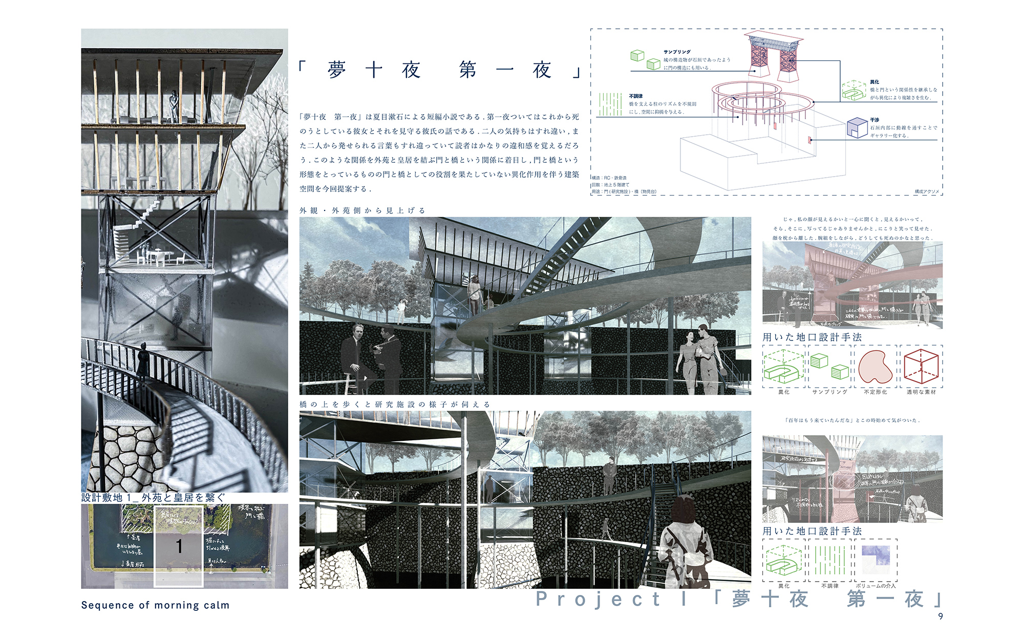 この手法を踏襲し、曖昧さを持つことで多義的解釈を可能とする空間装置の習作「朝凪のシークエンス」を提案する。