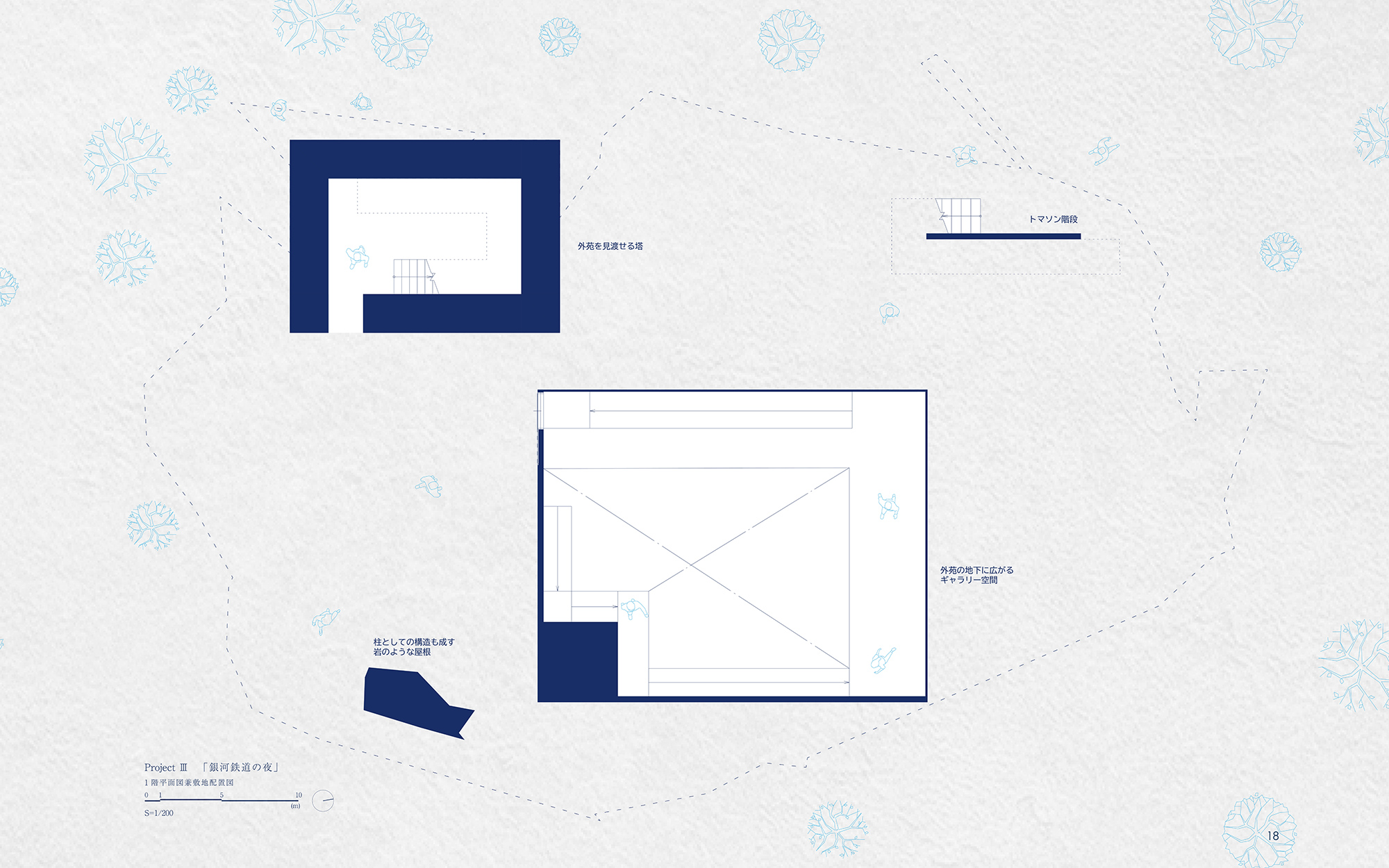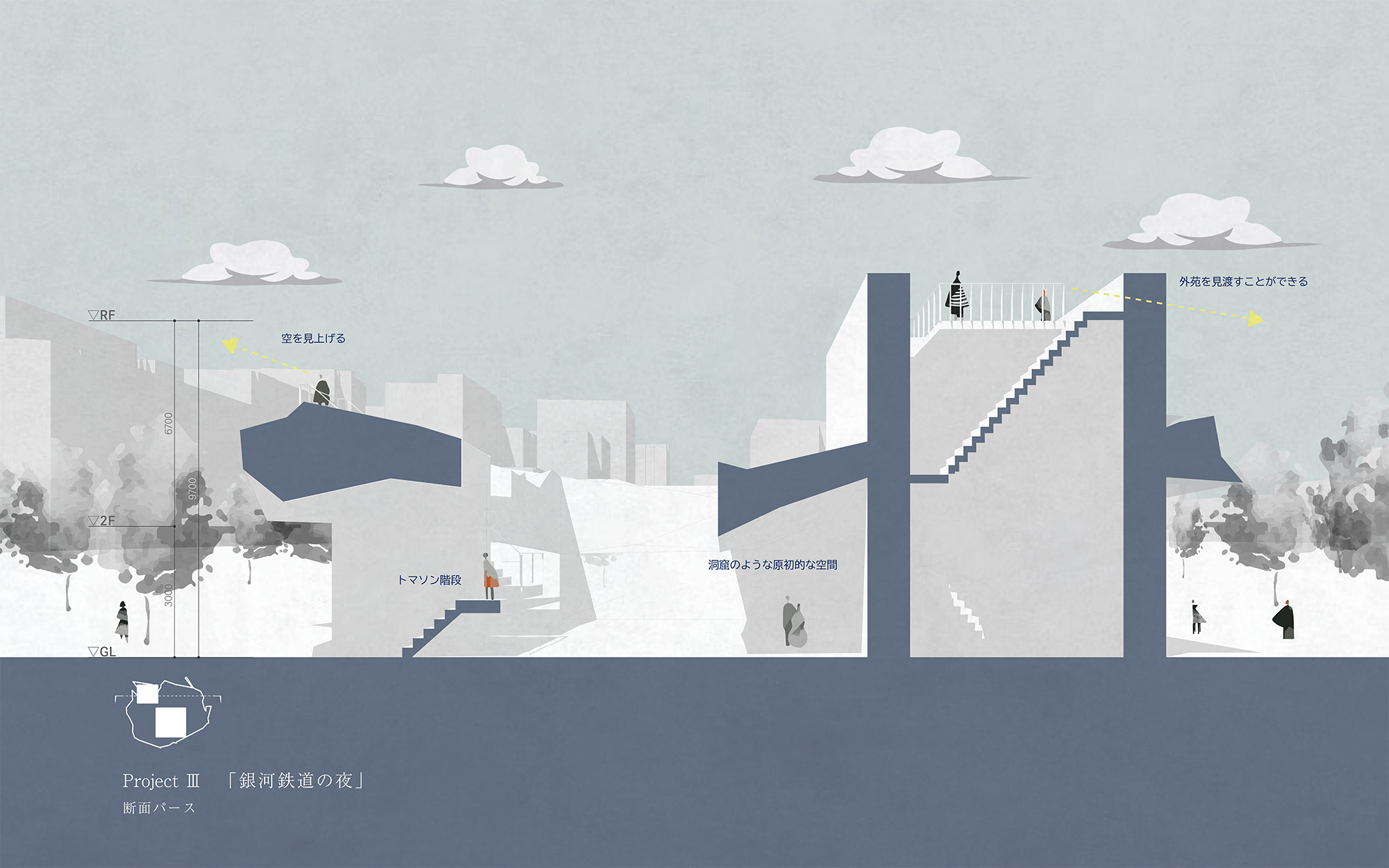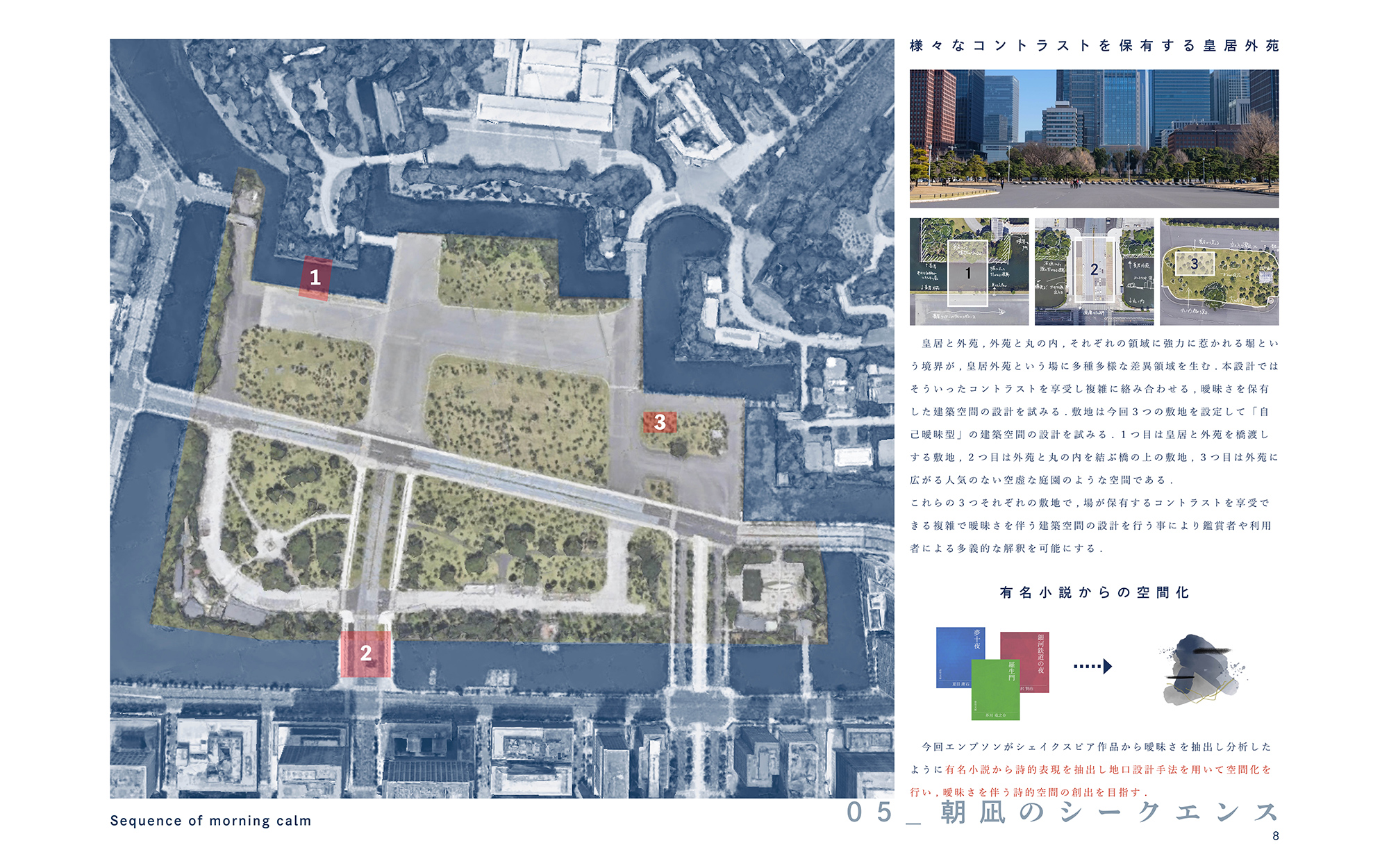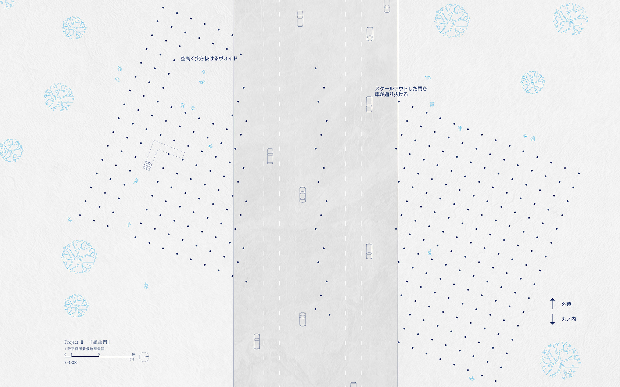 本設計では外苑の持つコントラストを享受し複雑に絡み合わせる、曖昧さを保有した建築空間の設計を3つの敷地を設定して試みる。