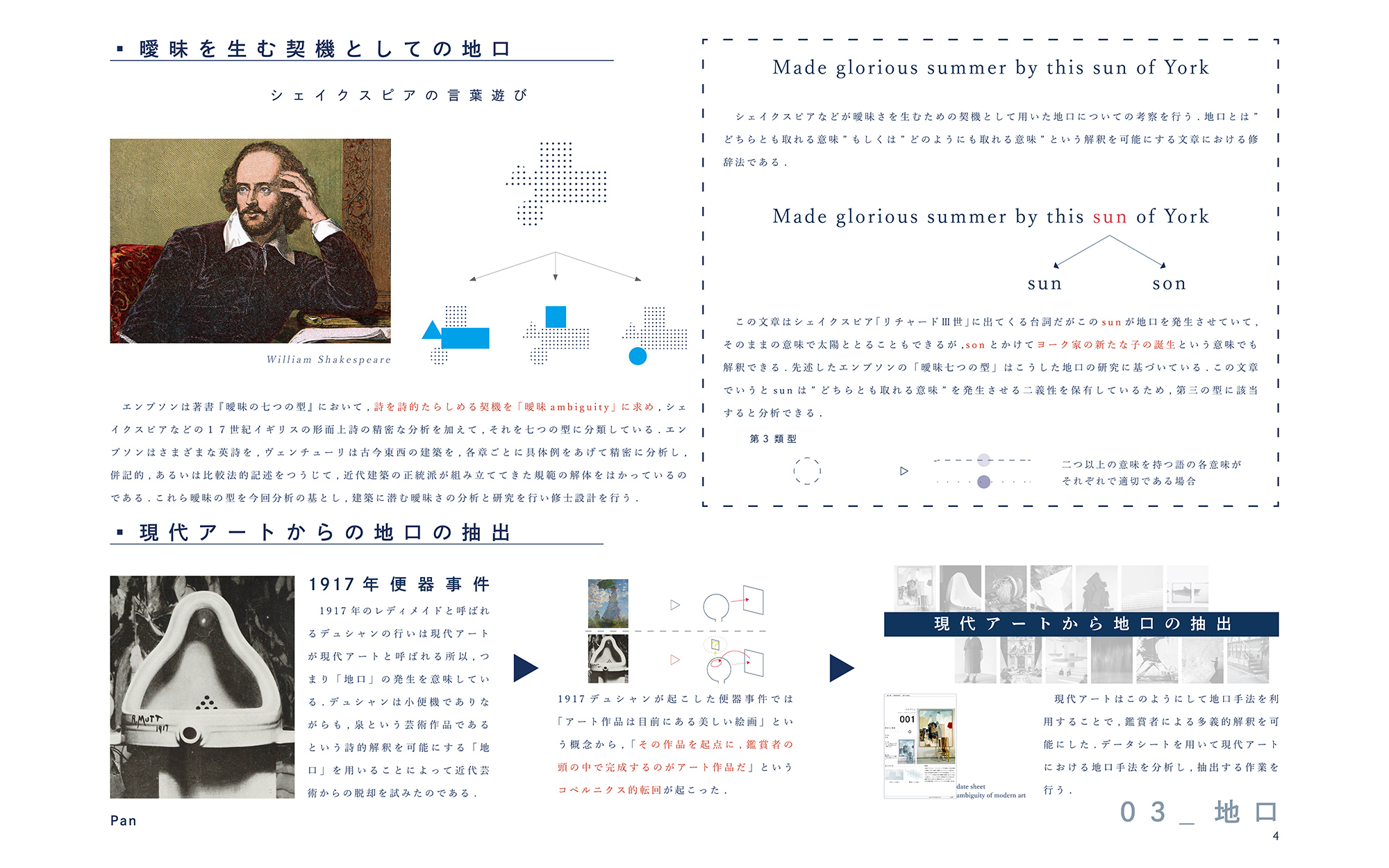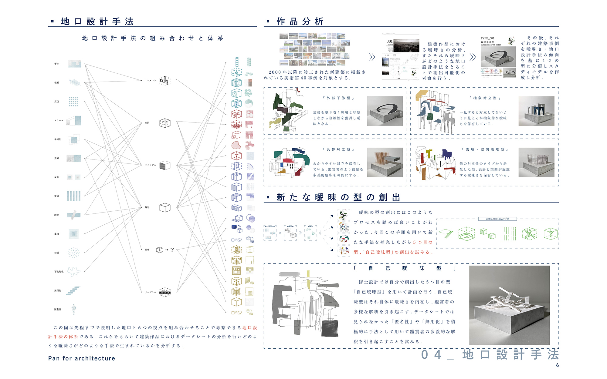 場が保有するコントラストを享受し、複雑で曖昧さを伴う建築空間の設計を行う事により鑑賞者や利用者による多義的な解釈を引き起こす。