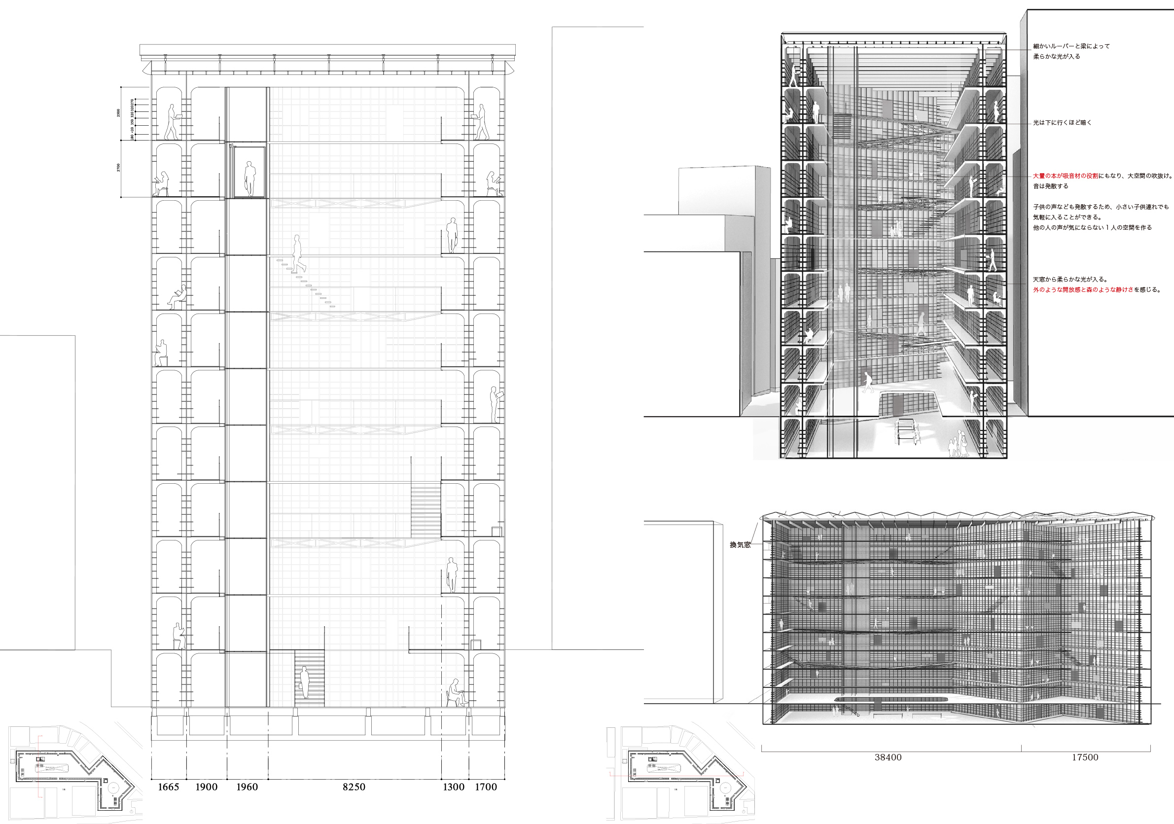 古書店は、敷居が⾼く⼊りづらいと感じている⼈や、⼦供連れで⼊りづらいと感じている⼈も、新三省堂では⼊⼝のファサードから内部の様⼦が⾒え、⼊りやすくなるだろう。中に⼊ると⼤きな吹き抜けに出て、また外に出た感覚になる。本が苦⼿な⼈でも通り抜けの感覚で様々な本に出会い新しい世界を⾒つけることができる。
