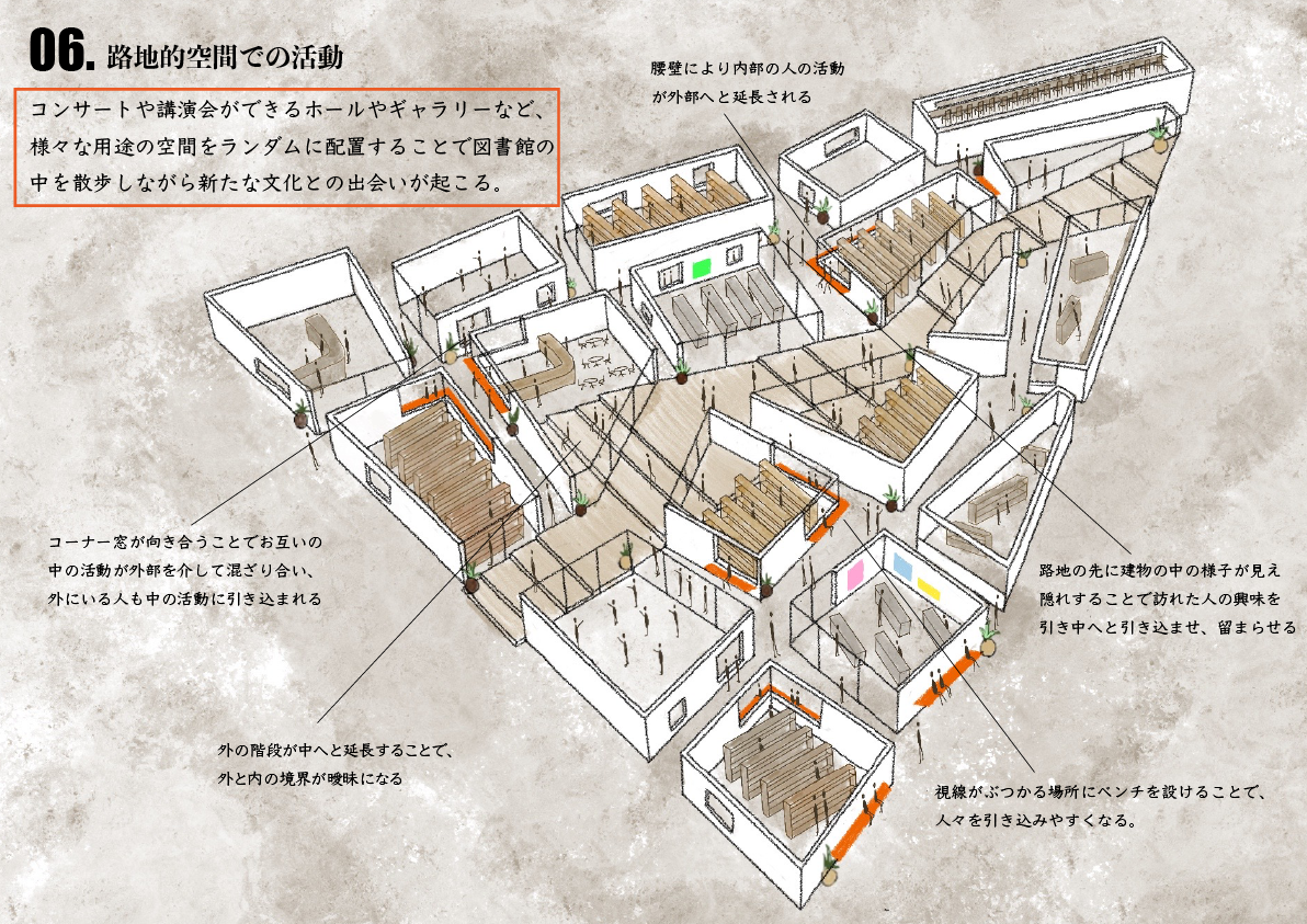 神保町は古本屋、スポーツ用品店、大学、楽器屋などさまざまなコミュニティが混在する街である。それと同じように人や車が忙しなく行き交い、古本屋の前で立ち止まる人々が目立ってしまうほど、神保町には留まる場所や速度の遅いものが存在しない。それにより、地域の憩いの場や社会的な繋がりを持つきっかけとなる物理的な場が失われている。そこで、図書館に訪れることで歩く速度が遅くなり、新たなコミュニケーションや、本や図書館で行われるさまざまな活動から新たな発見がある散歩道のような図書館を提案する。また、神保町は高層の建物が多く、垂直に長く伸びる建物により内と外の境界が明確であることが特徴として挙げられる。そこで、この図書館では外とうちの境界を曖昧にし、内と外の狭間で本を読むという新たな空間体験を提供すると同時に、内と外の境界が曖昧になることで、より多くの人が入り込みやすくなる。また、さまざまな文化が混在している街であるのにも関わらず、それぞれのコミュニティに属する人々が他のコミュニティに属する人々と交流する場が神保町には存在しない。そのため、この図書館が様々な文化が混ざり合う拠点となることを目指す。