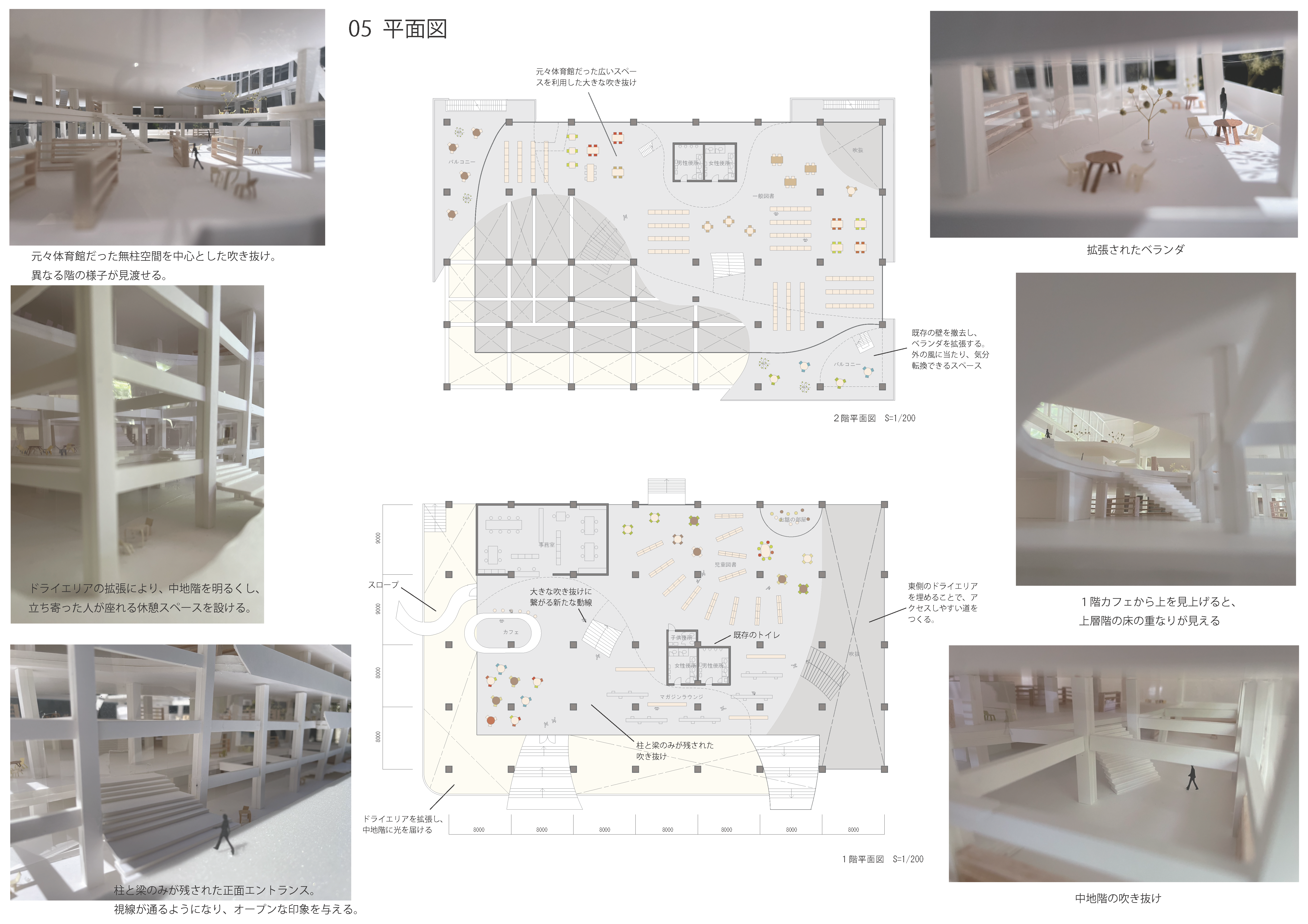 コミュニティセンターとして様々な人が出入りできる、開放された場所にするため、既存のフェンス、壁をできるだけ撤去した。また、内部の均質な空間に変化を与え、違う階にいる人の存在を認識できるような視線の通りをつくるために、既存の柱、梁を残しながら床を削る。