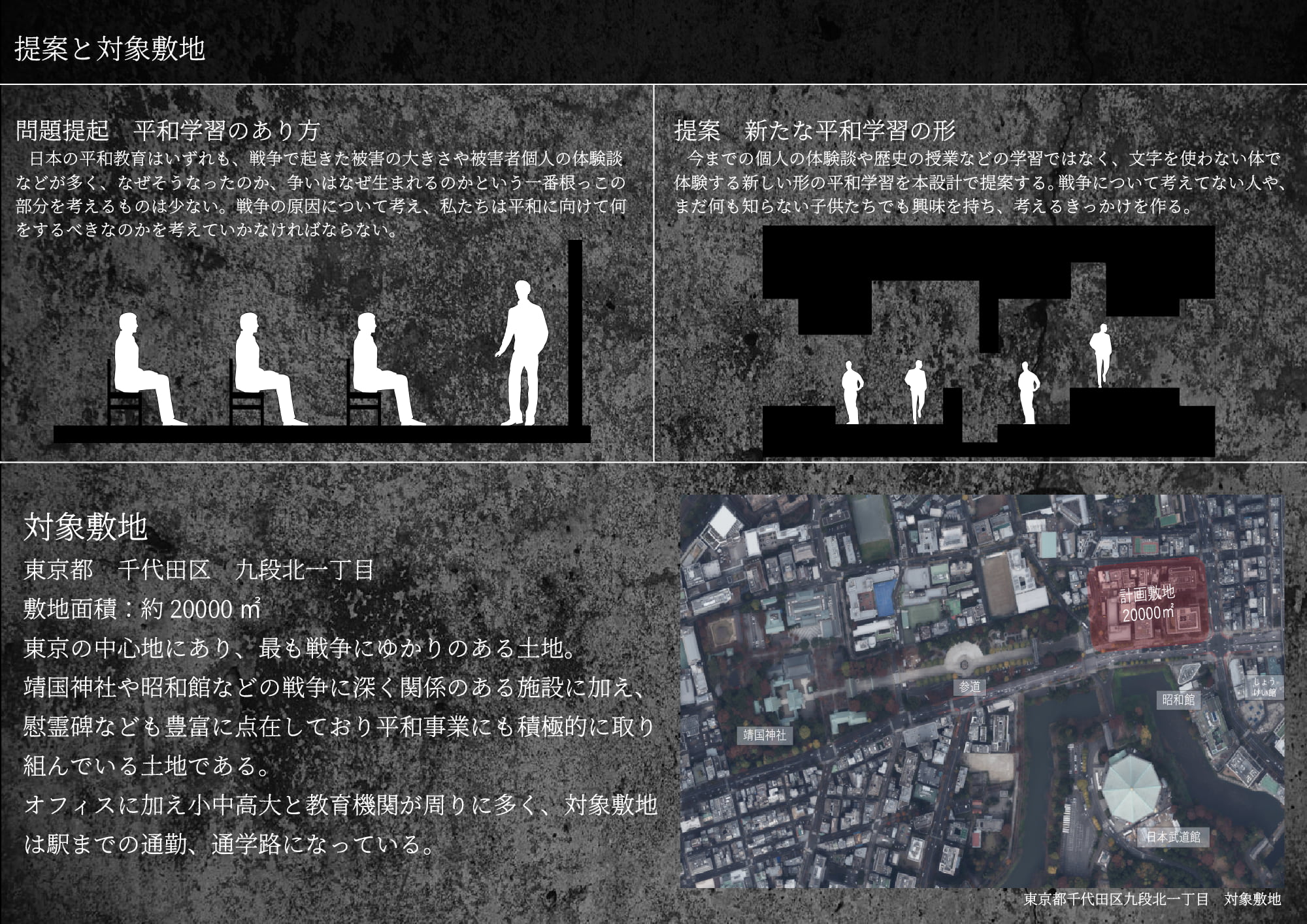 本制作では戦争の記憶が色濃く残る東京都・千代田区の九段下を敷地に選定した。周りには教育機関が多く立地しており、対象敷地は駅までの通学路にもなっている。