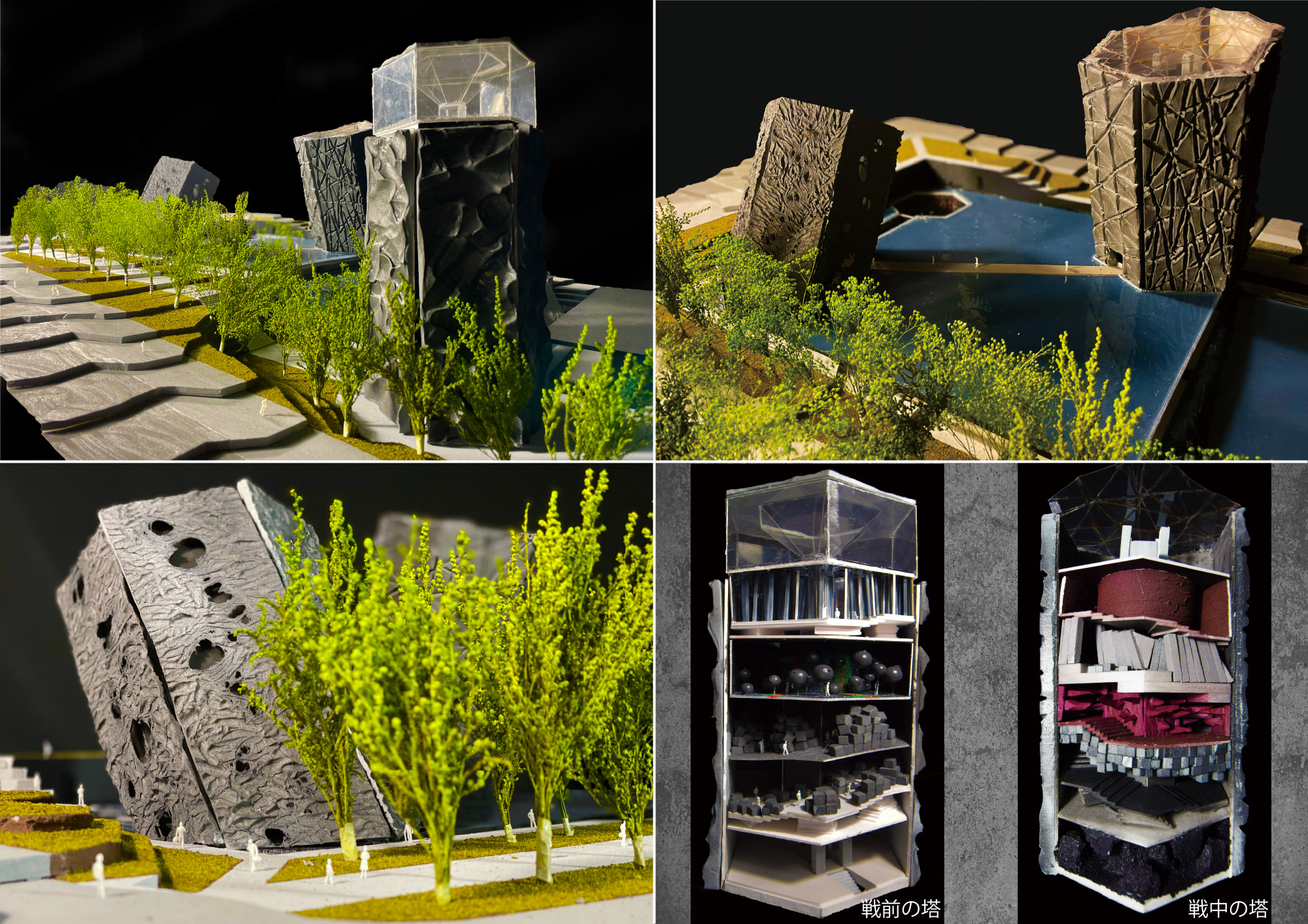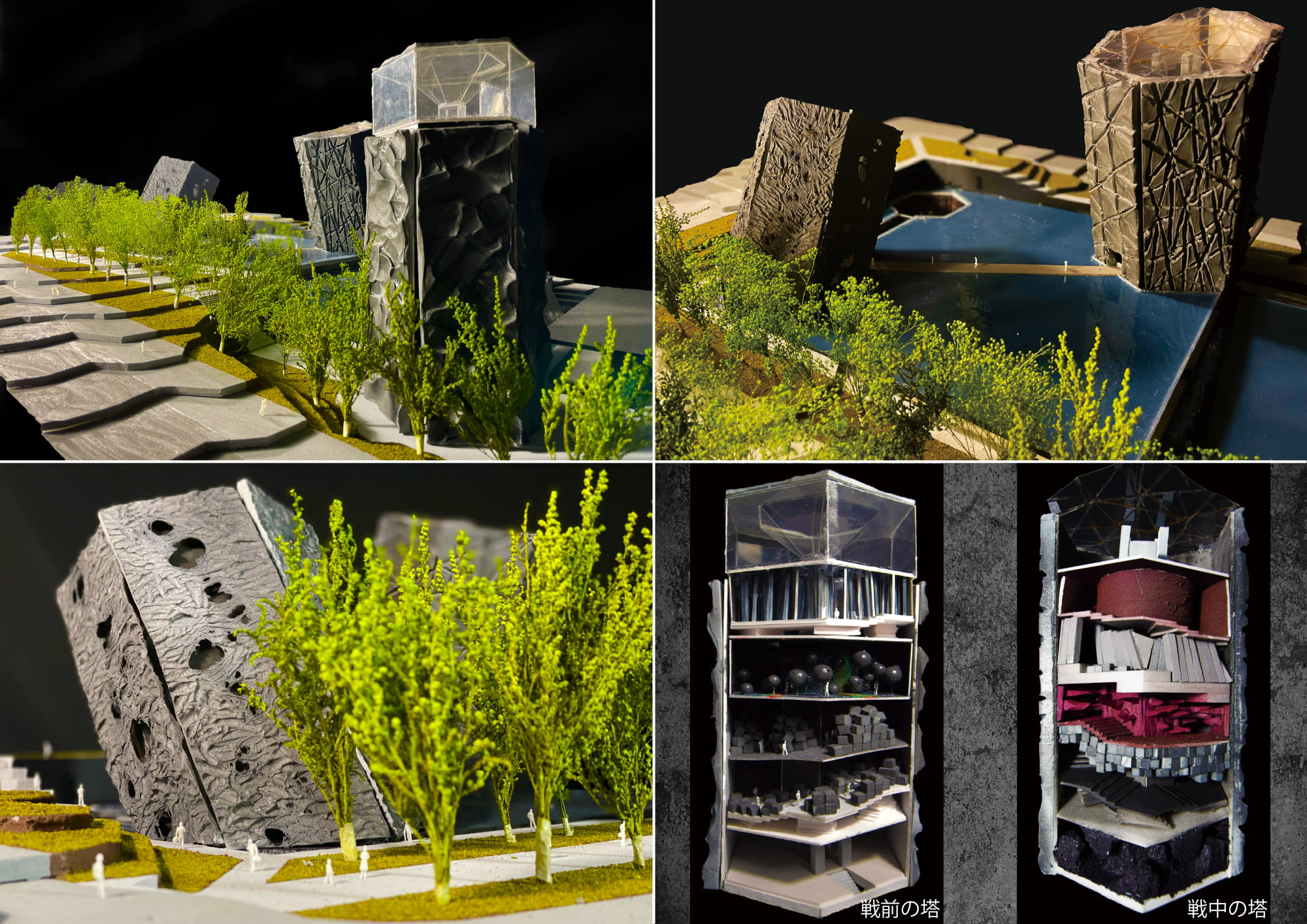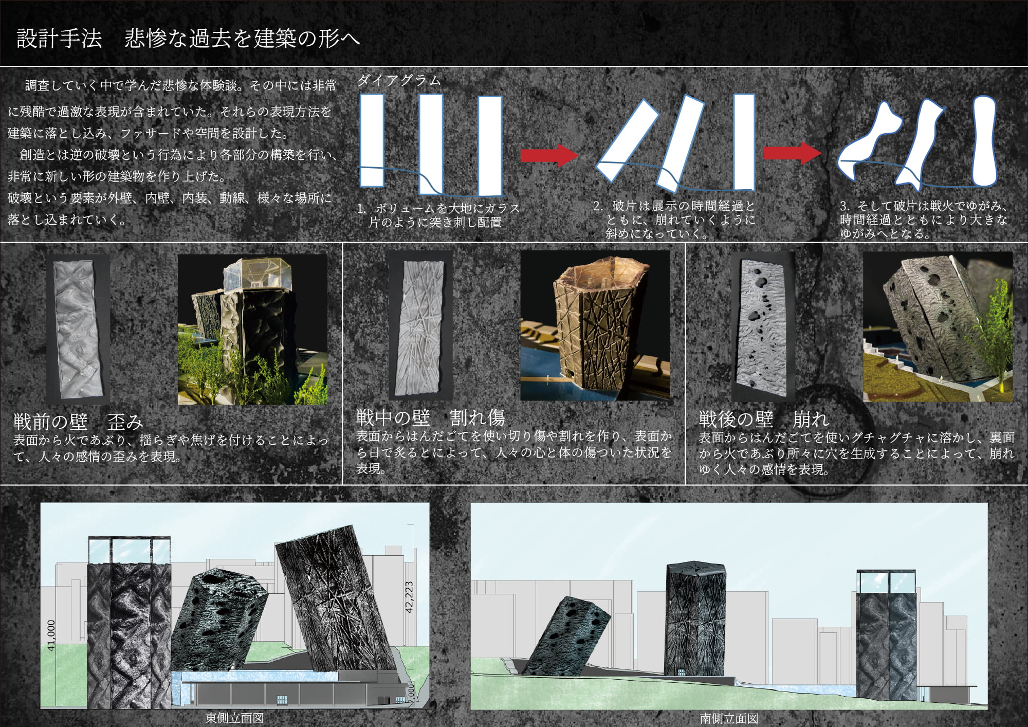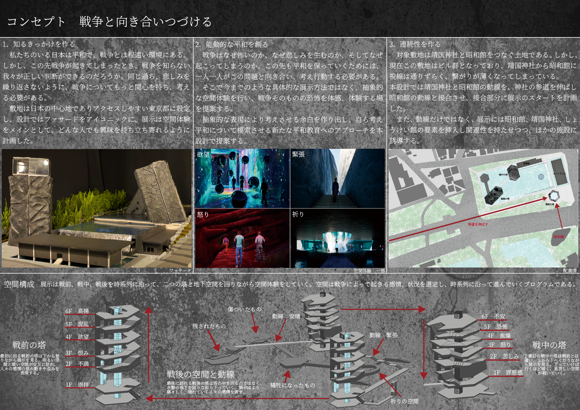 対象敷地の特徴を生かすため、大人から子供まで誰もが興味を持ち、体験談や写真を使わない、建築の空間だけで戦争の恐ろしさを体験させる今までにない新たな平和学習施設を提案する。